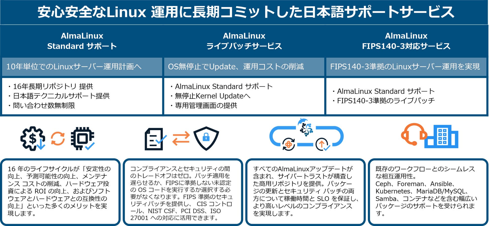 また、サイバートラストはAlmaLinux OSを運営する The AlmaLinux OS Foundationにプラチナスポンサーとして参画し、AlmaLinux OSの開発コミュニティへも積極的に参加しており、国内法人のニーズへの迅速な対応を目指します。
