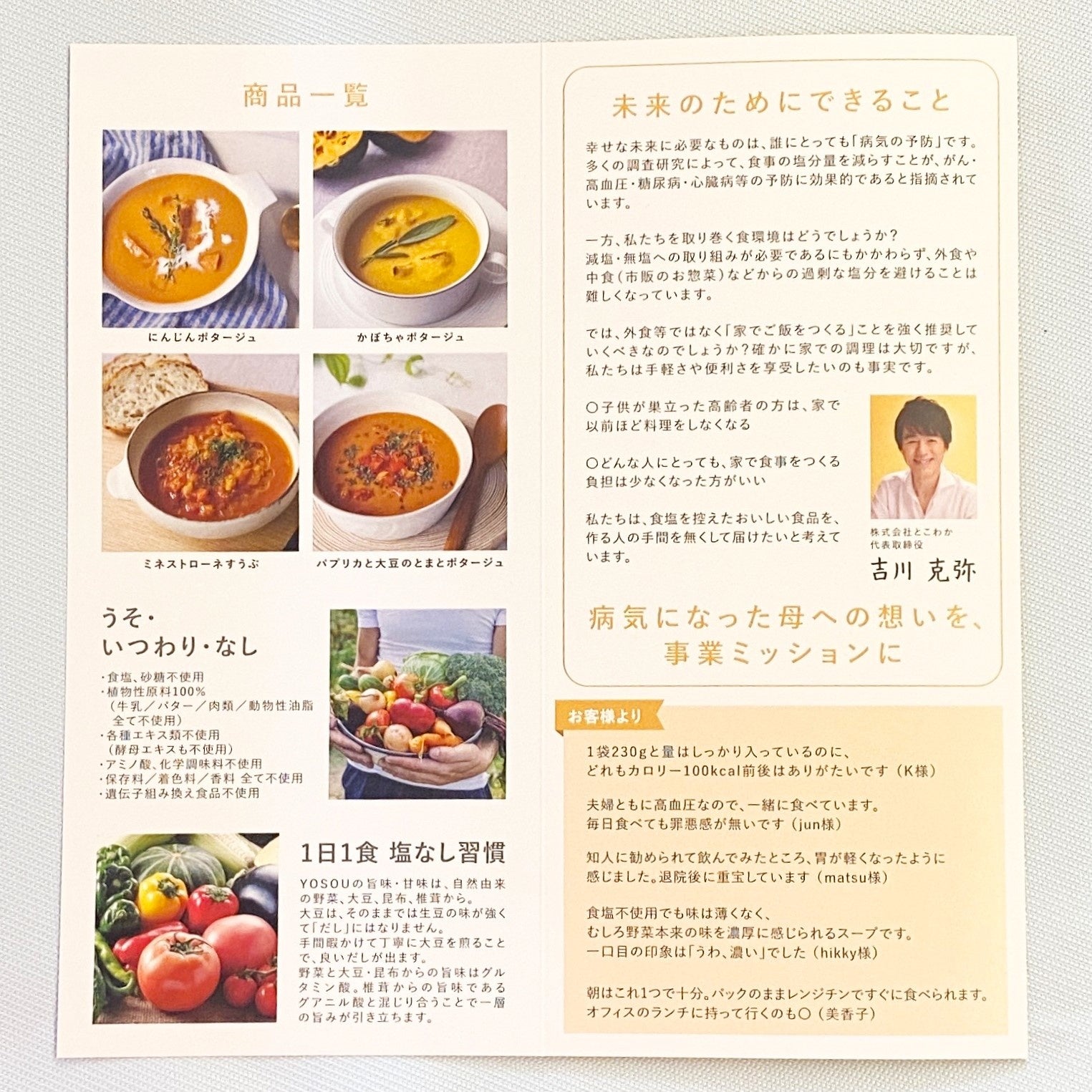 弊社代表(吉川克弥)の母が「がん」を罹患、ドクターの指導により厳しい塩分制限をした献立を志向することになったことをきっかけとし、同じ思いを抱えている方々に向け、YOSOUは誕生しました。