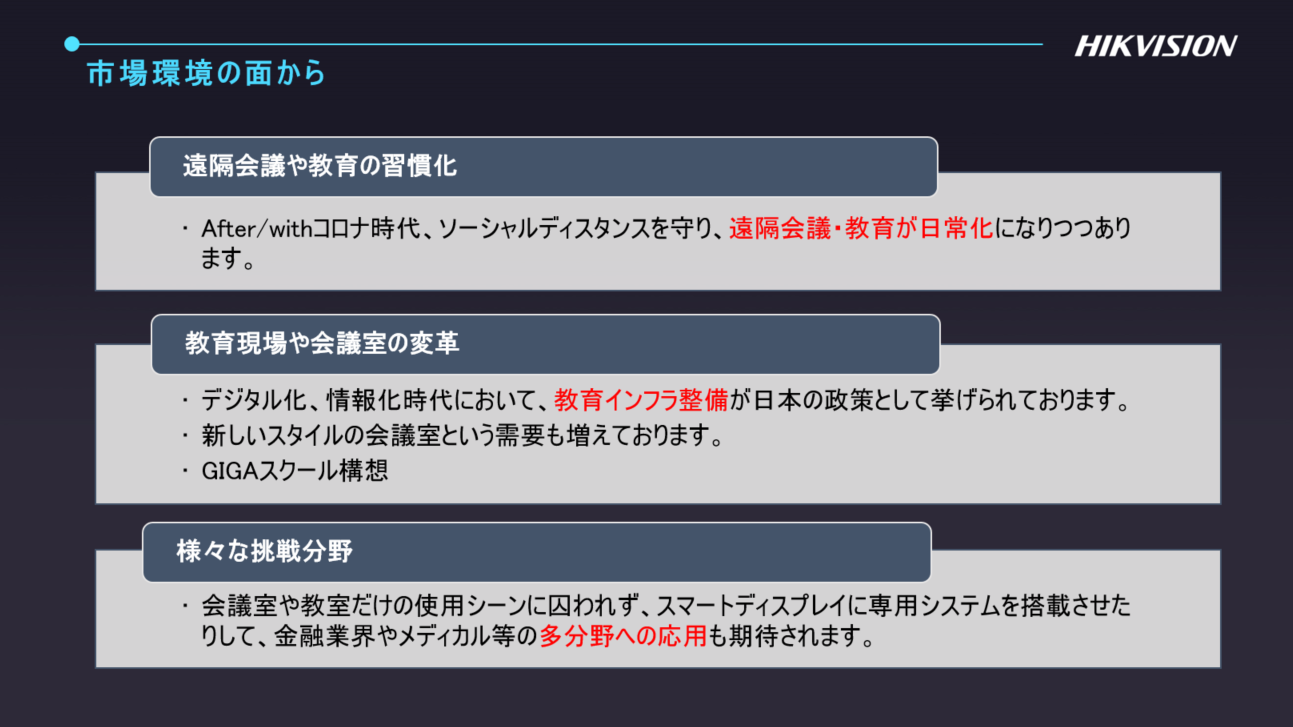 アフターコロナ時代で日常化になりつつあるリモート会議や遠隔教育において、更に問われる効率向上の課題に対し、スマートディスプレイはタッチスクリーンの魅力を最大限に活かし、遠隔でも対面コミュニケーションしているような没入感を与えます。