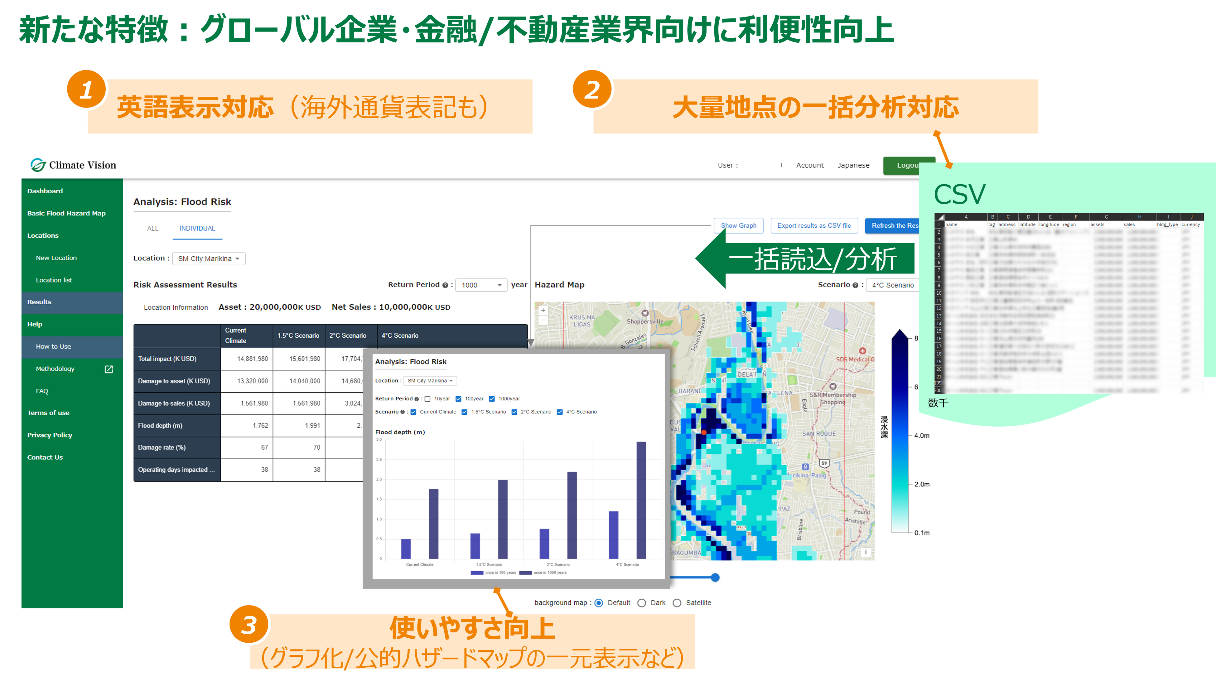 気候リスク分析プラットフォーム「Climate Vision」のバージョンアップにより、英語表示や一括大量分析などに対応