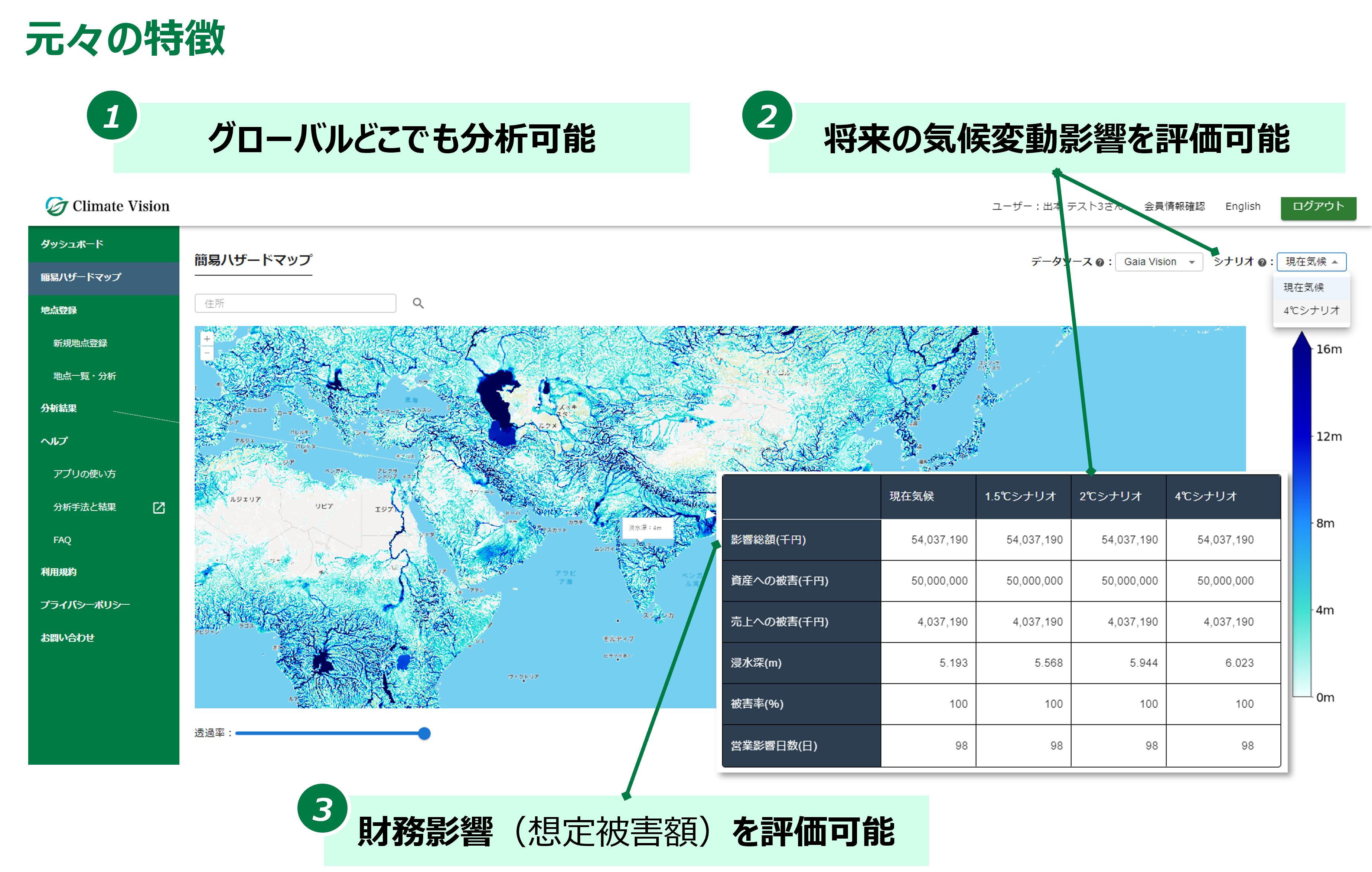 Climate Visionは、企業の保有拠点等に対して洪水リスクを簡単に評価できるプラットフォームです。製造業/物流業などのリスク管理部門やサステナビリティ部門に利用されてきました。昨今増加する気候変動リスクへの対応やサステナビリティ情報開示(TCFD/CDP/ISSB等)への対応のため、企業は洪水リスク分析や気候シナリオ分析が求められていますが、既存ツールでは対応できないケースも多くありました(国のハザードマップが日本国内に限られる等)。その中で、Climate Visionは、「グローバルどこでも分析可能」「将来の気候変動影響を評価可能」「財務影響を評価可能」という点が評価されてきました。