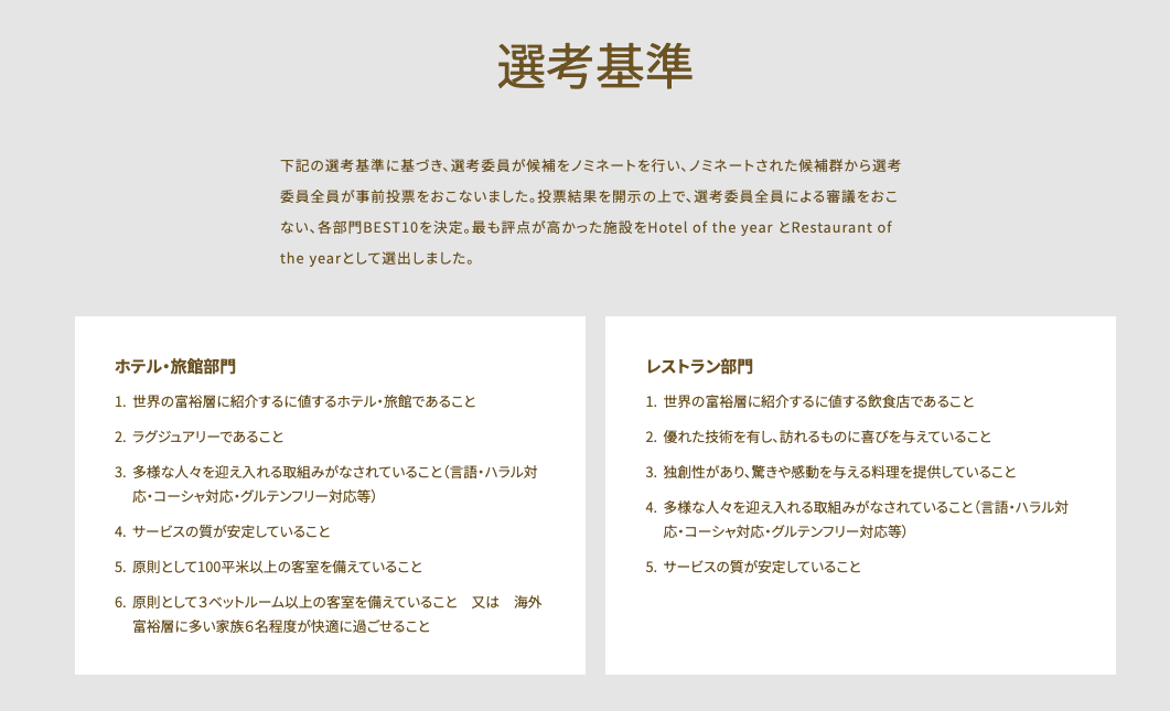 選考委員長は建築家の隈研吾氏が務め、料理評論家の山本益博氏をはじめとする各界のプロフェッショナルによって各部門のBEST10を選考し、最も優れた施設にはHotel of the year と Restaurant of the yearの称号が贈られます。