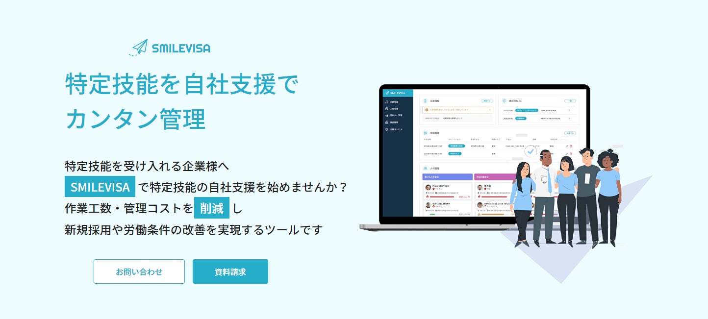 「SMILEVISA」は、2019年4月にできた新しい在留資格「特定技能」に関して、受け入れ要件判定、書類作成の自動化、自動翻訳機能、受け入れ以降の管理業務、定期報告や帳票データをオンラインで管理できる機能を搭載し、これまで複雑であった特定技能の受け入れに対するソリューションを提供しています。