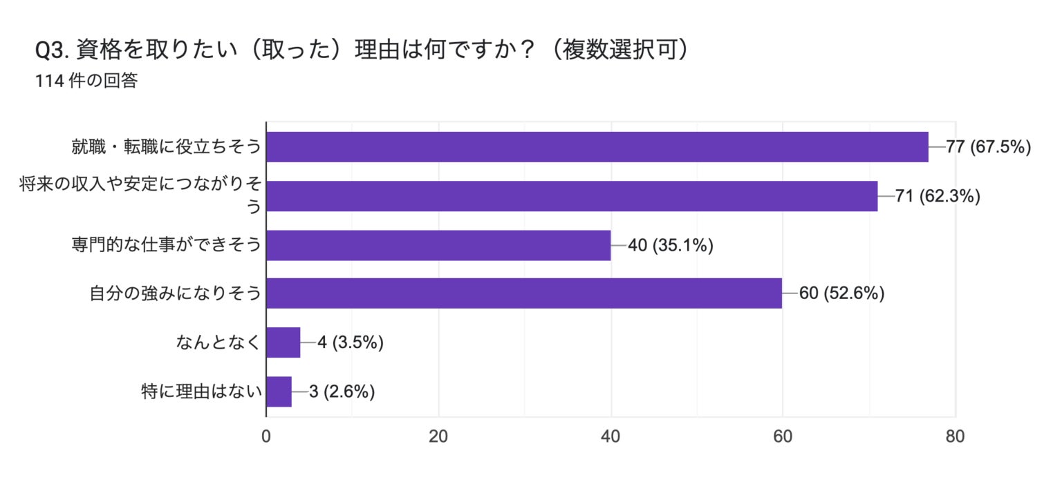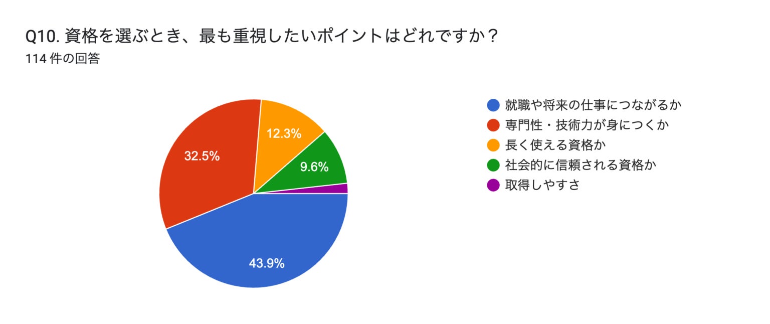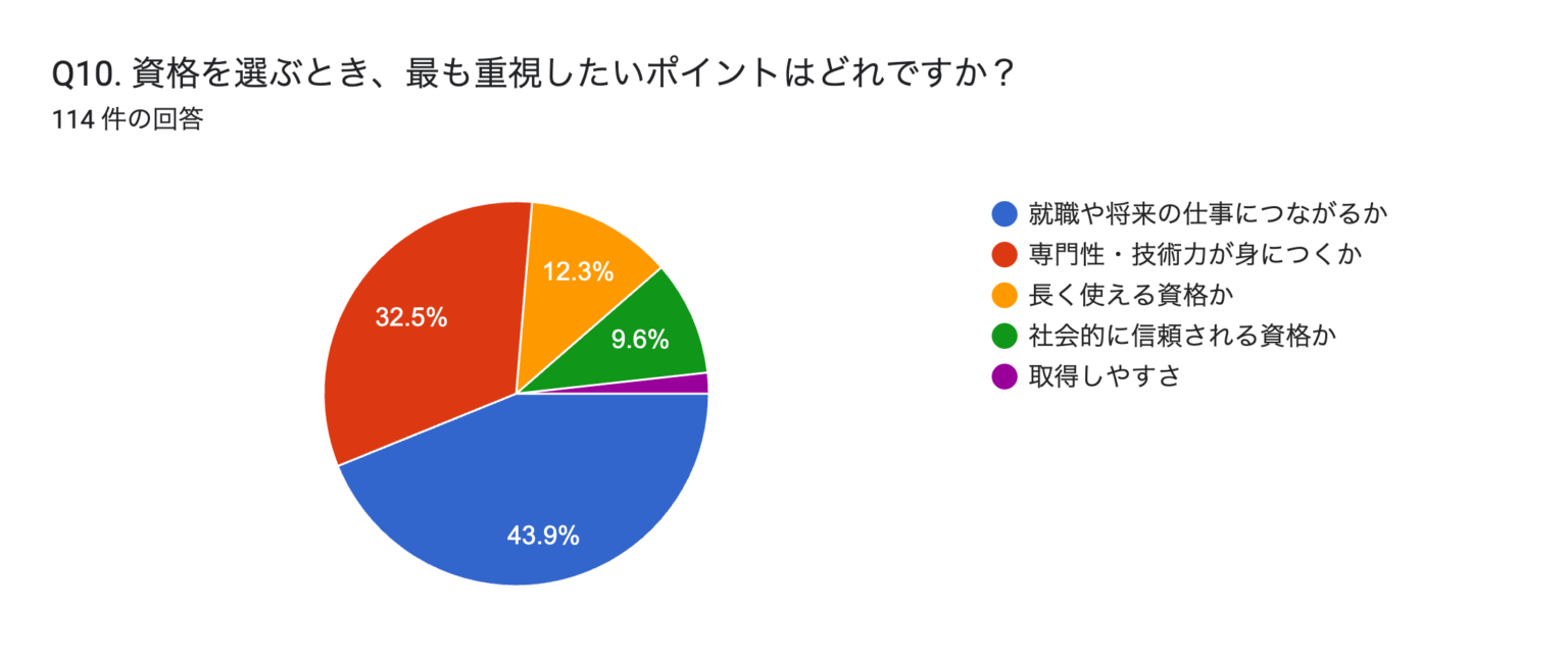 若年層が資格を選ぶ際に最も重視しているのは、「取りやすさ」ではなく「仕事につながるかどうか」です。資格は「学びの証」というより「将来に効く手段」として捉えられており、「就職・転職への有利さ」「将来の収入・安定」が重視されています。