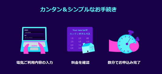 オクトパスエナジーのウェブサイトは、料金シミュレーションからお申し込みまでを手軽に行えるシンプルなつくりです。ご自宅の郵便番号を入力してから、料金シミュレーション → 料金プラン選択 → お申し込み手続き、さらにお申し込み後の「マイページ」画面でのご契約内容、料金の確認まで、シンプルでカンタンな一本道のプロセスで完結できます。