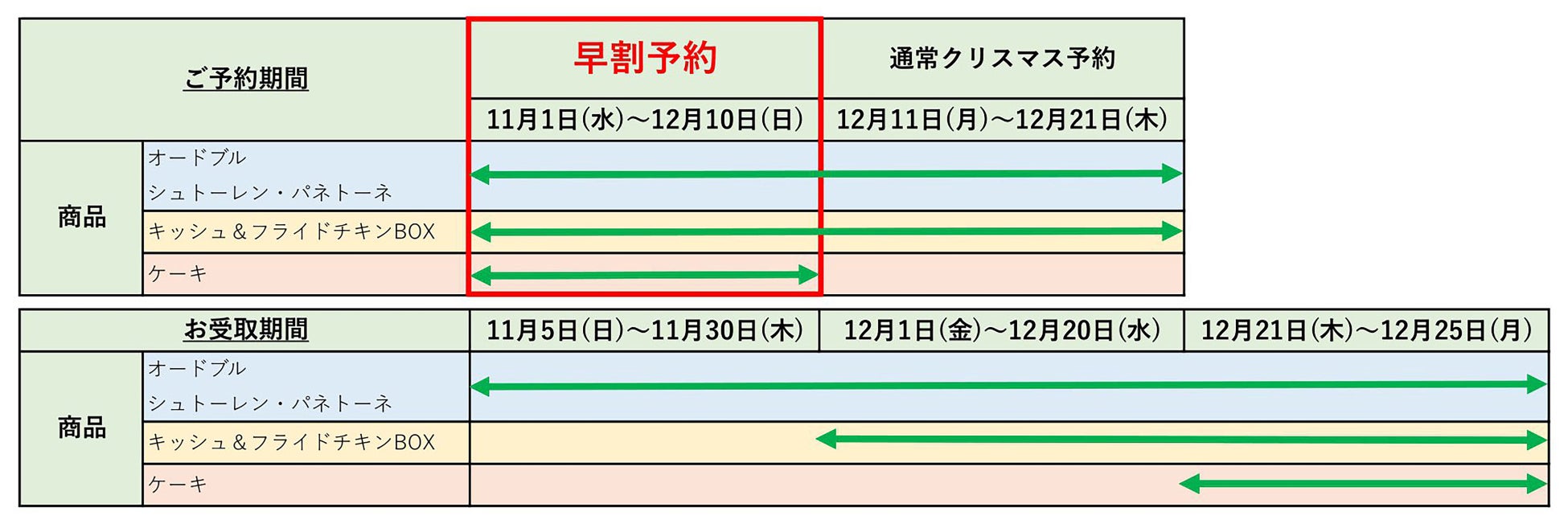 ◆早割予約:11月1日(金)~12月10日(火)の期間で予約いただくと予約商品を税込価格から10%OFFいたします。
