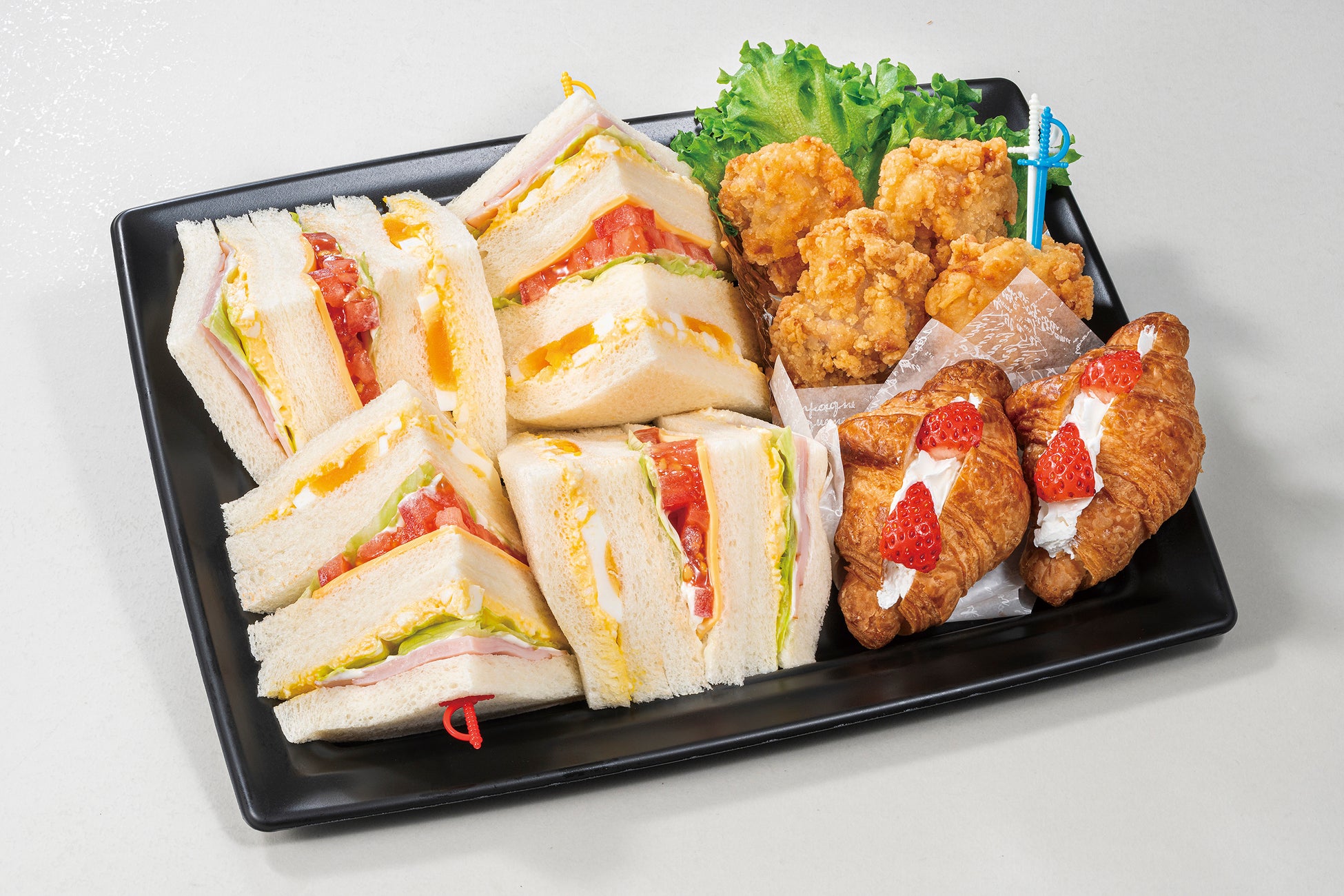 内容:たまご・トマト&チーズ・ハム&たまご・ミニクロワッサンのいちごサンド・唐揚げ