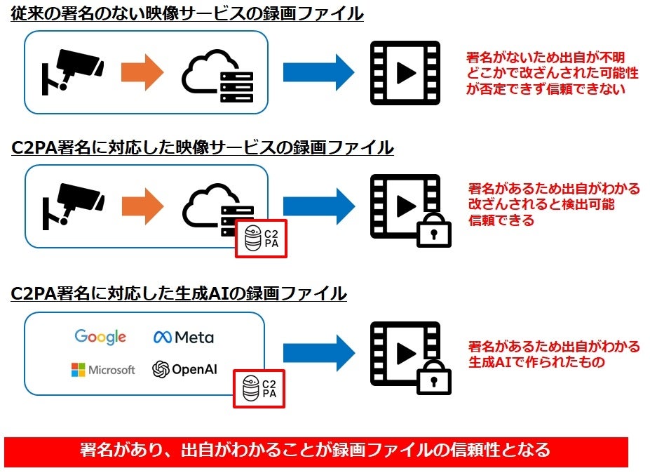 生成AI技術の進化により、映像コンテンツの生成や改ざんが容易になり、著作権侵害やディープフェイクの脅威などが深刻な社会問題となっています。また、映像カメラを導入する企業、特に産業分野においては監視映像や点検記録、証拠映像などの信頼性が大きく問われるようになっています。