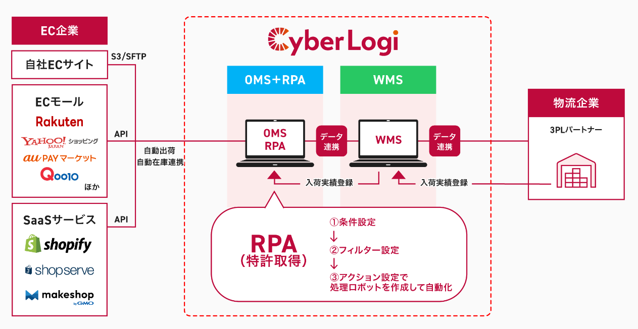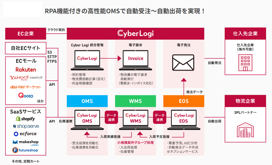 サイバーロジ利用者は、クラウド上で初期費用、固定費無料で物流サービスの利用が可能となります。大半のモール、カートとのAPI連携を実現、受注データだけでなく在庫データ(同期)の連携を実現します。独自開発した高性能OMSやRPAを利用者にご提供する部分が他社にはないサービスとなります。これにより、商品マスタの2重管理が不要になり、受注処理の自動化率も向上し、利用者の業務負担を大幅に軽減可能としました。