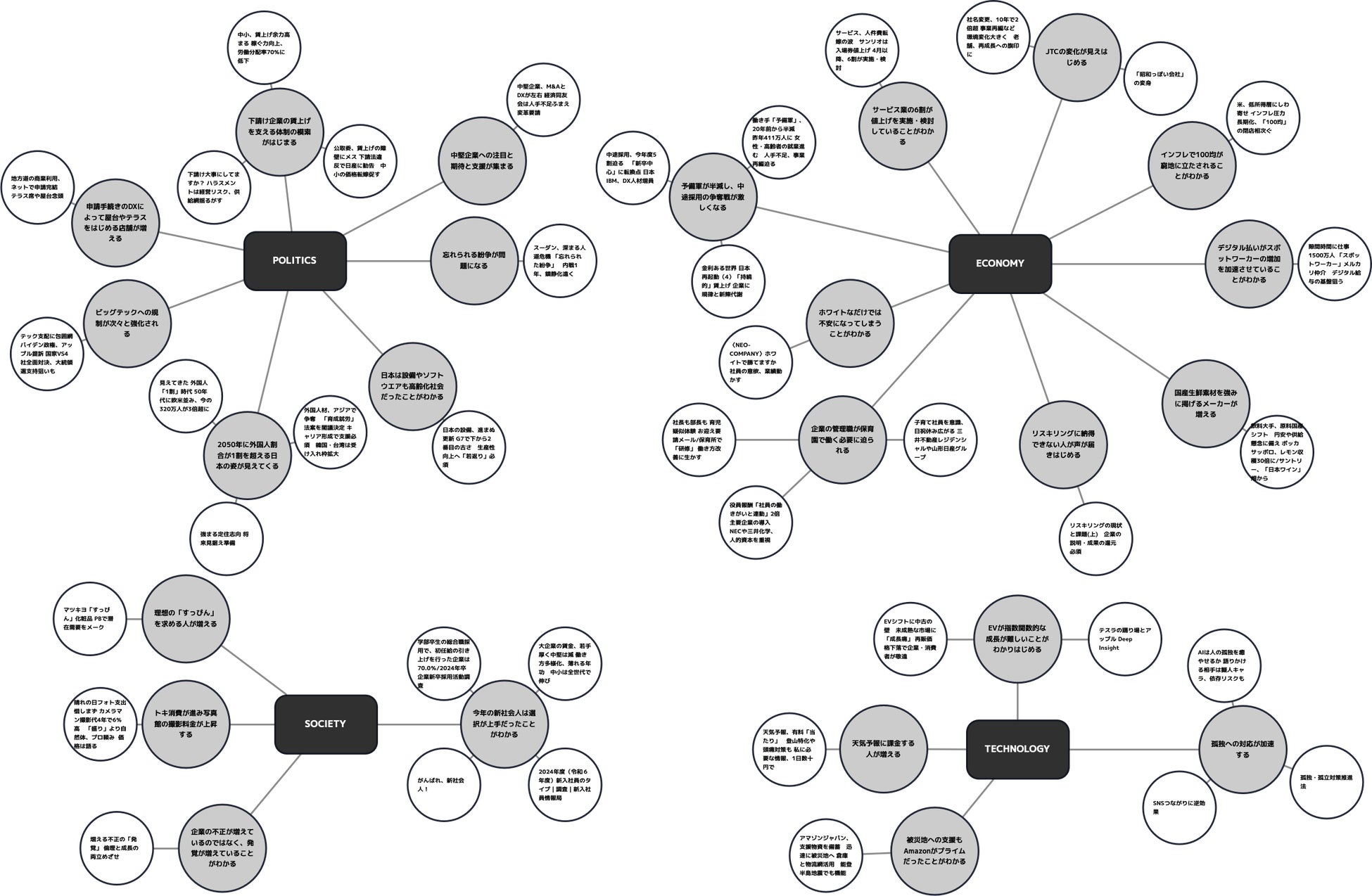 5月号では以下のようなPEST分析のダイアグラムを共有し、その中から10のトピックを発表しました。