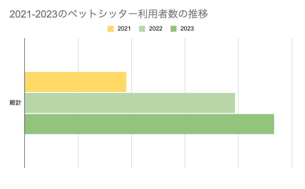 2021年から2023年のペットシッティング案件の依頼数は、2021年と比較して2022年は2.1倍、2023年は2.4倍と右肩上がりの推移となりました。