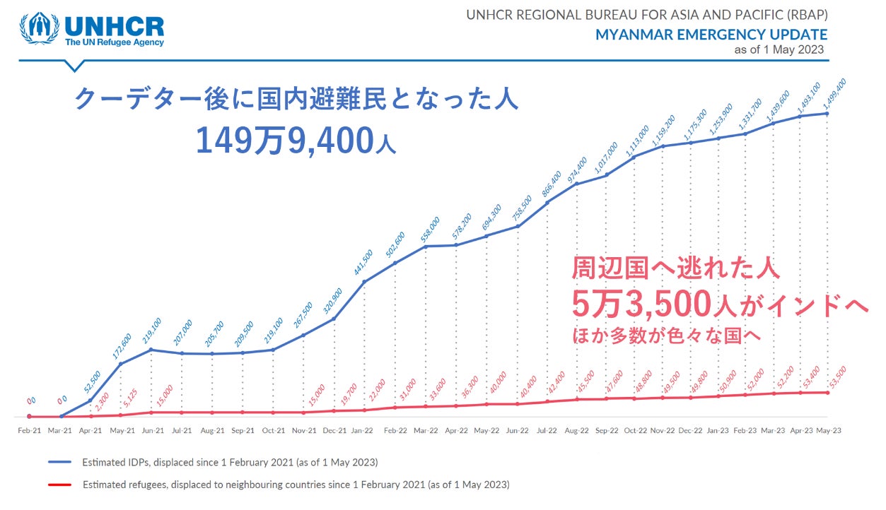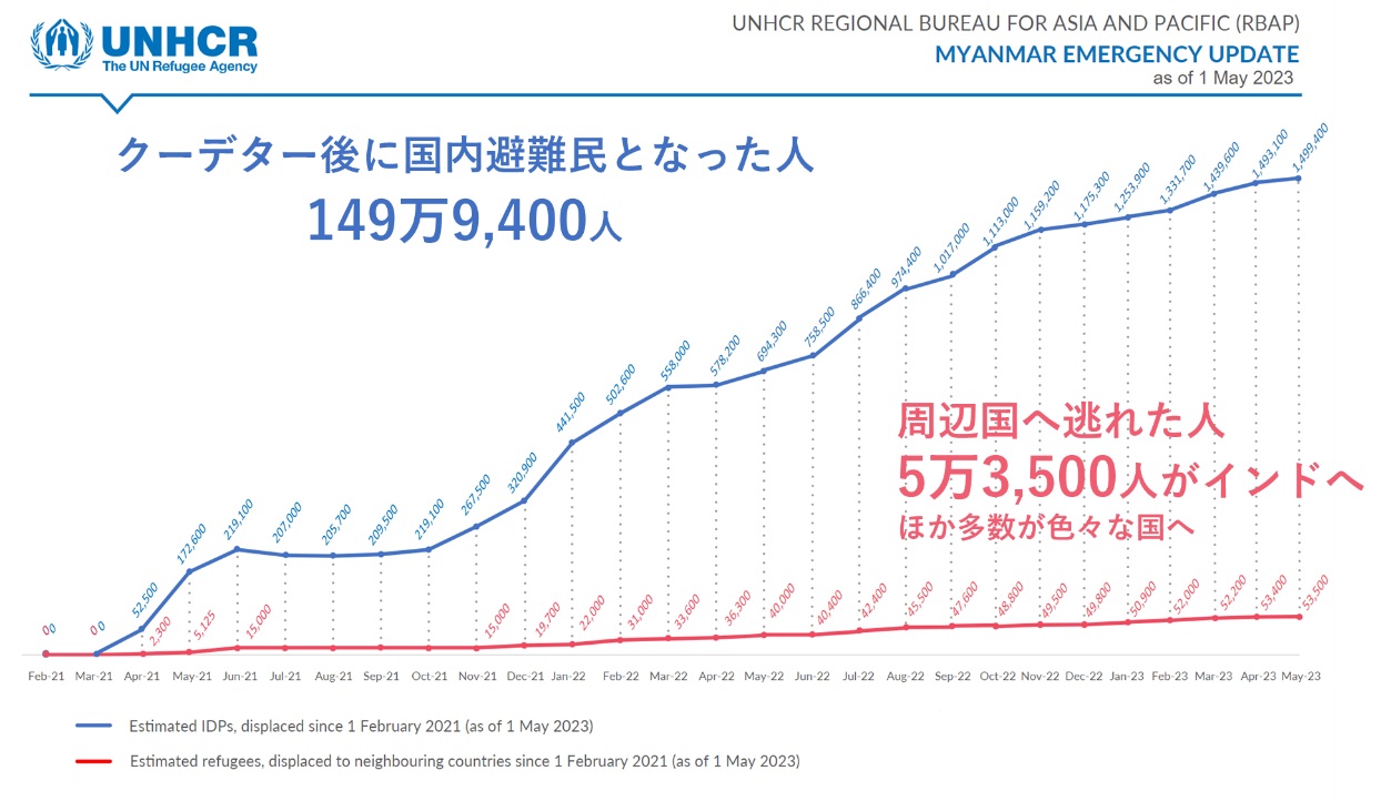 この非武装の抵抗に対し国軍は、容赦なく銃口を向けました。子どもでも妊婦でも容赦せず、拷問し、殺害しています。さらに、抗議活動に直接参加した人だけでなく、無差別に市民を殺害しています。今では人びとは防空壕を掘り、飛行機を見たら隠れなければならなくなりました。空爆や砲撃により多くの命が失われ、2023年5月時点で、少なくとも3,567人が殺害されました。国外に避難した人は5万人を超え、戦闘を逃れ森の中などに避難している国内避難民は150万人にのぼり、今も増え続けています。