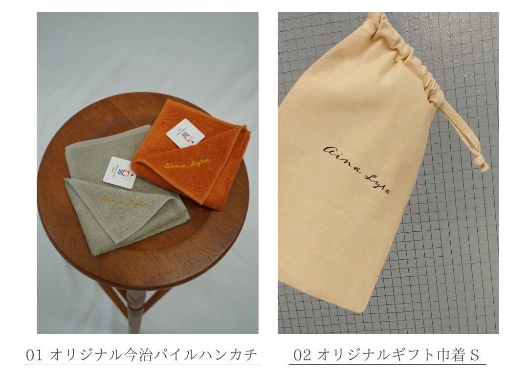 今治パイルハンカチは秋の訪れを感じる「オレンジ」とシンプルなデザインの「グレーベージュ」の2種類をご用意。巾着にはainaLyraで発売中のアイテムが1点すっぽり入る大きさなので、ハンカチとセットで大切な人へのギフトとしてもおすすめです。ぜひ、この機会にainaLyraの世界観をお楽しみください。
