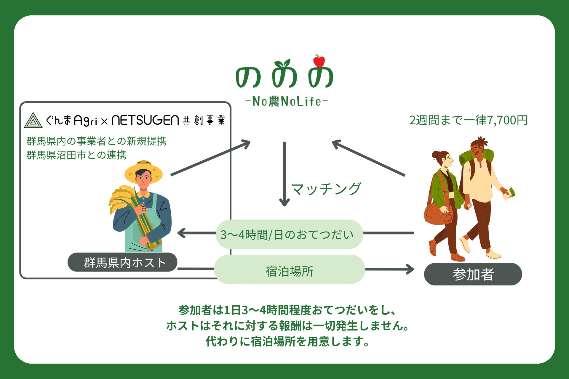 今回の実証事業では、短期間の労働力を求める群馬県内の農家を受け入れ先とし、「ののの」上で参加者を募集、マッチングを行います。若年層の参加が多いため、SNSを活用した情報発信も期待され、地域産業のPRにもつながるため、関係人口創出へ貢献ができます。また、1泊2日から参加可能なため、都心部のビジネスパーソンの参加も見込まれます。