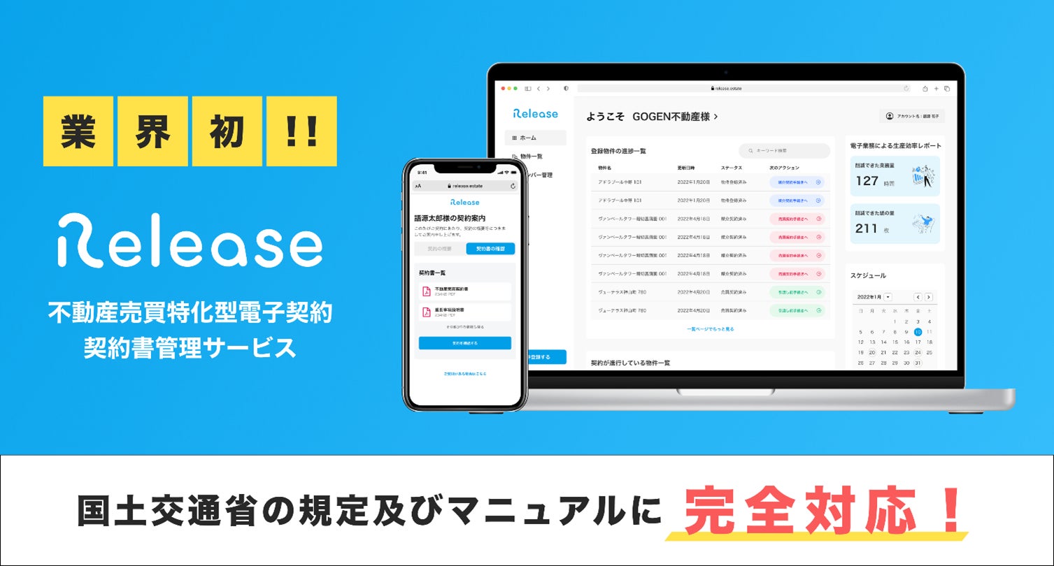 GOGEN株式会社(本社:東京都渋谷区、代表取締役CEO:和田浩明)は、2022年3月9日より事前登録を開始した不動産売買に特化した業界最安値(※1)の電子契約サービス「RELEASE(レリーズ)以下:レリーズ」において、2022年4月27日に国土交通省より公表された「宅地建物取引業法施行規則(以下:施行規則)」の電子契約に係る改正内容、および「重要事項説明書等の電磁的方法による提供及びITを活用した重要事項説明実施マニュアル(以下:電磁的重説マニュアル)」(※2)の電子契約部分に業界に先駆けて完全対応したことをお伝えします。