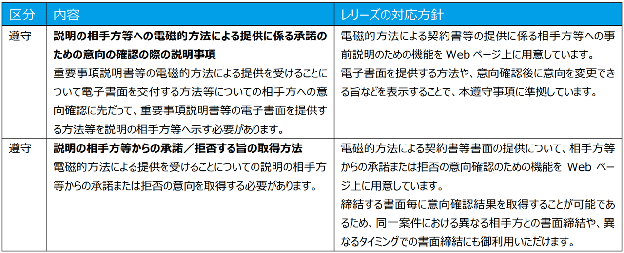 本件対応により、レリーズを御利用いただく不動産デベロッパーや仲介会社など不動産事業者は、施行規則および電磁的重説マニュアルに適合した形で電子契約への対応を進めていただくことが可能です。