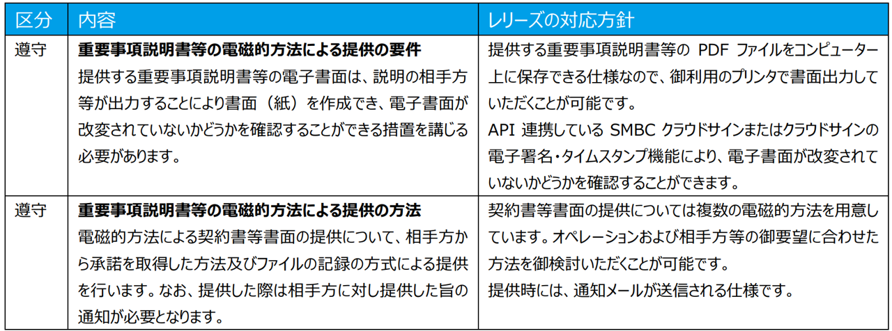 電磁的重説マニュアルの「遵守すべき事項」または「留意すべき事項」とされた各項目に係るレリーズの対応方針(抜粋)は以下の通りです。