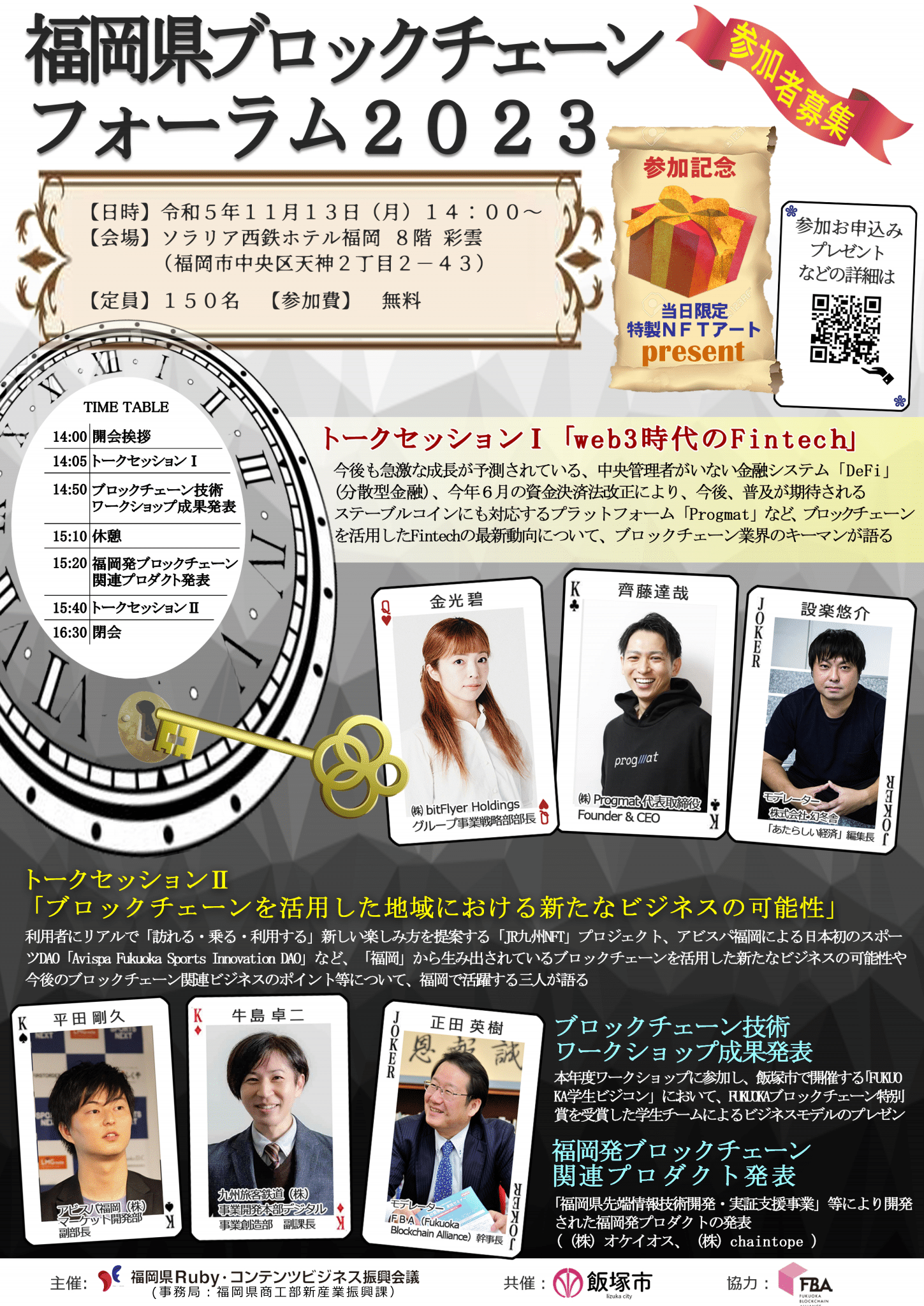 そのほか、県内大学生によるブロックチェーン技術ワークショップの成果発表や福岡発ブロックチェーン関連プロダクトの発表も行います。
