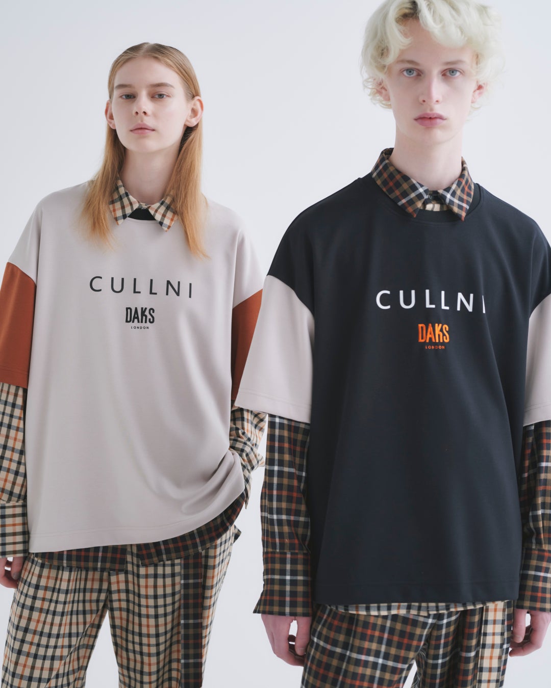 胸元に CULLNI と DAKS のロゴをあしらったTシャツやプルオーバー。チェックシャツとのレイヤード使いで、これからの季節にぴったりのアイテムです。