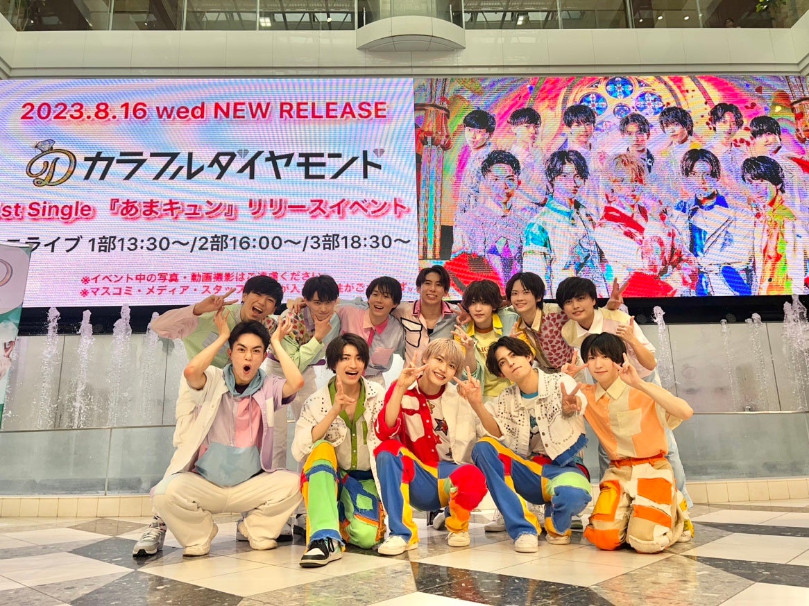 この度、東海地区を中心に全国で活動するBOYS AND MEN(通称:ボイメン)などが所属している株式会社フォーチュンエンターテイメント(本社:愛知県名古屋市)より新たなボーイズグループ:カラフルダイヤモンド(古川流唯、中下雄貴、内海太一、設楽賢、高垣博之、國村諒河、岡大和、小辻庵、石田侑也、関優樹、永遠、加藤青空)が8月16日にデビュー曲「あまキュン」をリリース致します。本作を引っ提げてデビューイベントを全国で行っており、6月20日にサンシャインシティ噴水広場(東京都池袋)で開催いたしました。ミニライブでは12人のメンバーそれぞれ12色の衣装でステージに立ち「あまキュン」やカップリング曲「未来ダイヤモンド」などを披露いたしました。