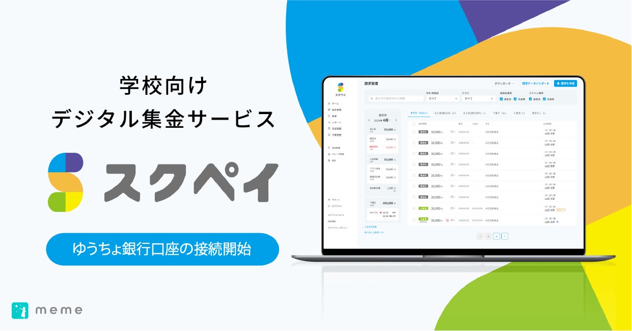 株式会社MEME(本社:東京都中央区、代表取締役・齋藤舞、以下「MEME」)が運営する学校向け集金サービス『スクペイ』にて、2024年6月27日(木)から、GMOペイメントゲートウェイ株式会社(本社:東京都渋谷区、以下「GMO-PG」)の口座直結決済サービスを通じて、株式会社ゆうちょ銀行(本社:東京都千代田区、以下「ゆうちょ銀行」)の銀行口座からの即時引落しがご利用いただけるようになることをお知らせいたします。