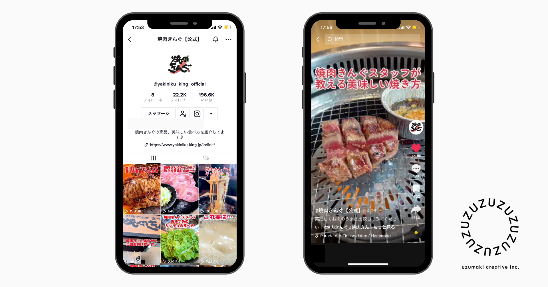 Z世代向けSNSマーケティング事業を展開する、株式会社uzumaki creative(本社:東京都渋谷区、代表取締役:木田陽真、以下:uzumaki creative)は、株式会社物語コーポレーションが運営する焼肉きんぐのTikTokの運用支援をいたしました。
