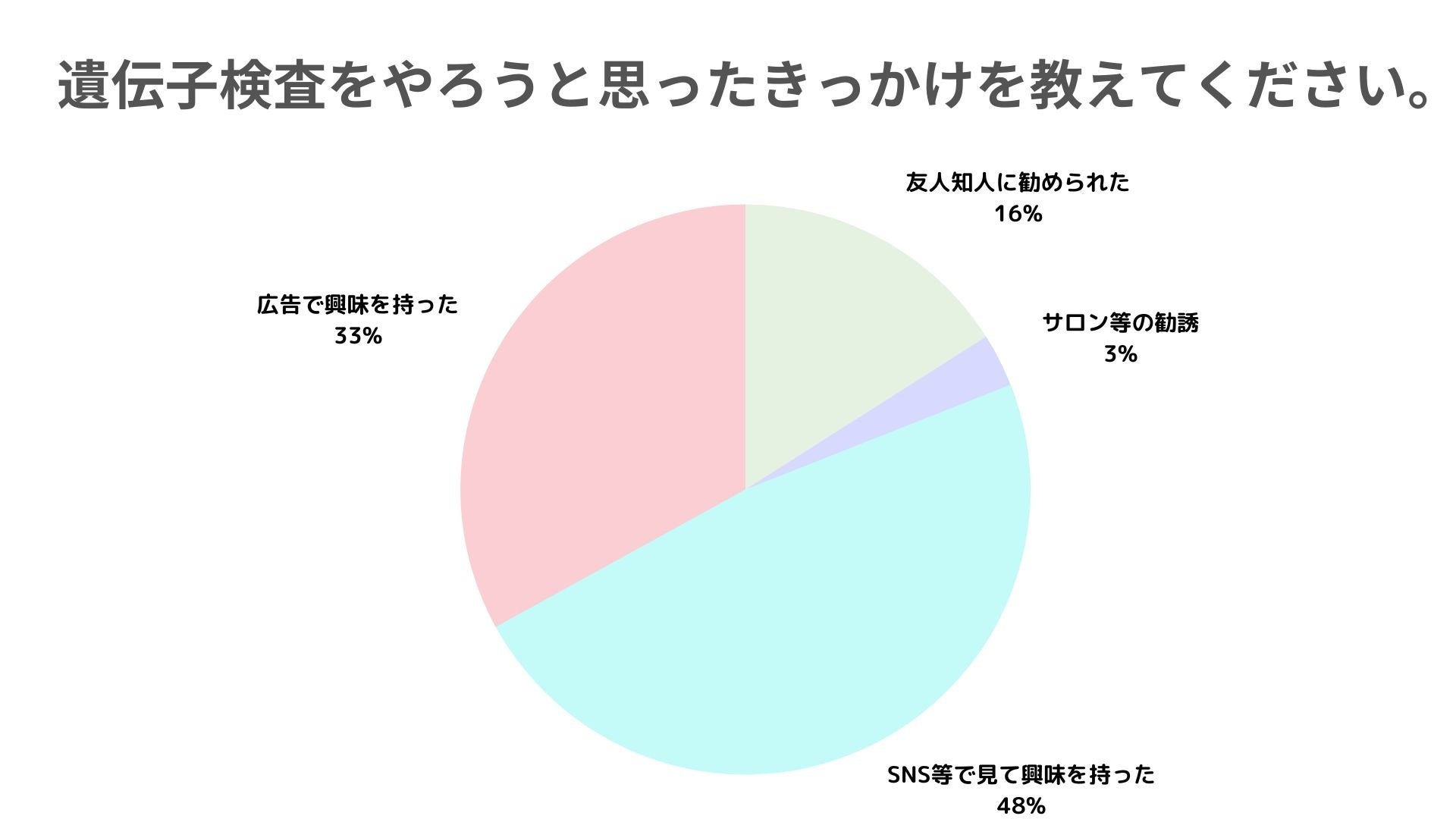 前の問いで、「遺伝子検査をやったことがある」という回答が6.6%と少ないこと、今回の問いで「友人知人に勧められた」という回答が16%と少ないことから、遺伝子検査を受けたことがある方が身近にいないことが想定されます。