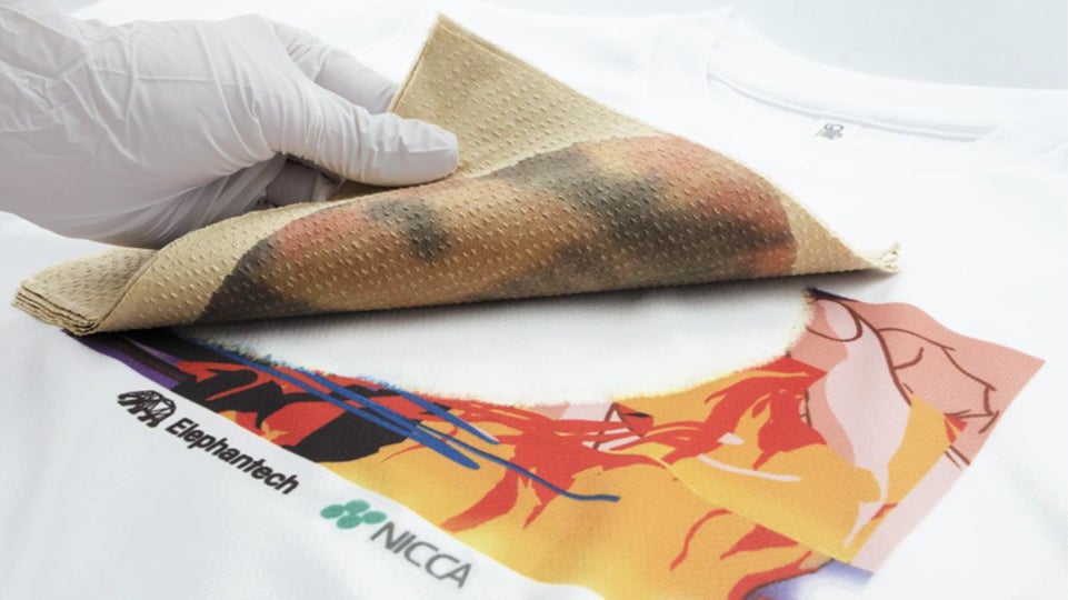 昨今の人々のサステナビリティ意識の向上により、アパレル、テキスタイル素材の大量廃棄が社会問題となっており、ファッション、スポーツアパレル素材のアップサイクルによる地球資源の有効利用、環境負荷低減は私たちの使命です。当社は、エレファンテック社との共同開発にて、分散染料にて染色されたポリエステル繊維から安全性の高い薬剤を用い、大掛かりな設備を使用することなく、また水を使用せずに染料のみを数分間でほぼ完全に脱色出来る革新的な技術を開発しました。脱色された箇所は新たに染色、プリントすることが可能であり、この技術を使えば何度でも新たなプリントデザインが楽しめます。