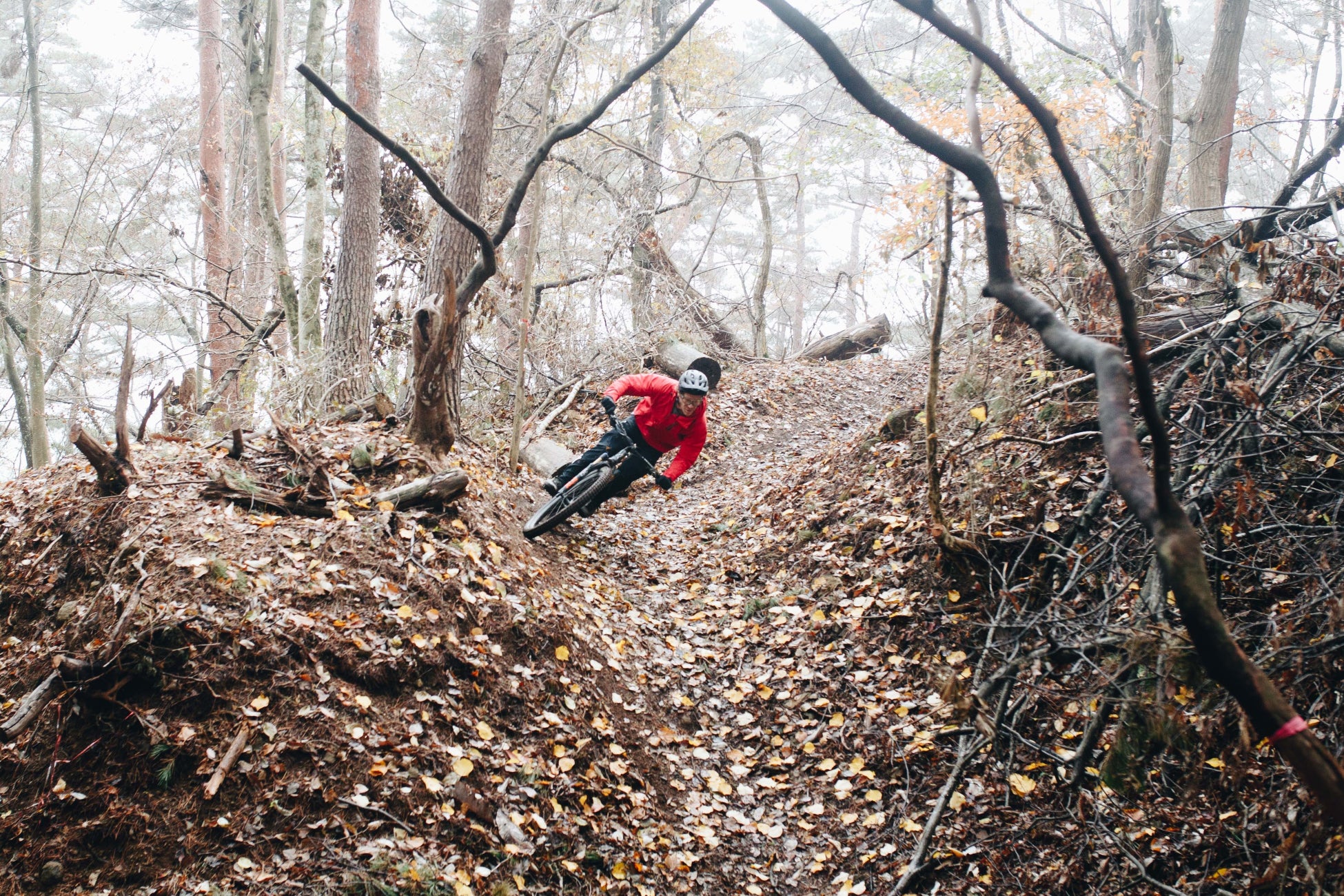 落ち葉が積もるダイナミックな古道をライド。これぞ日本のMTB。
