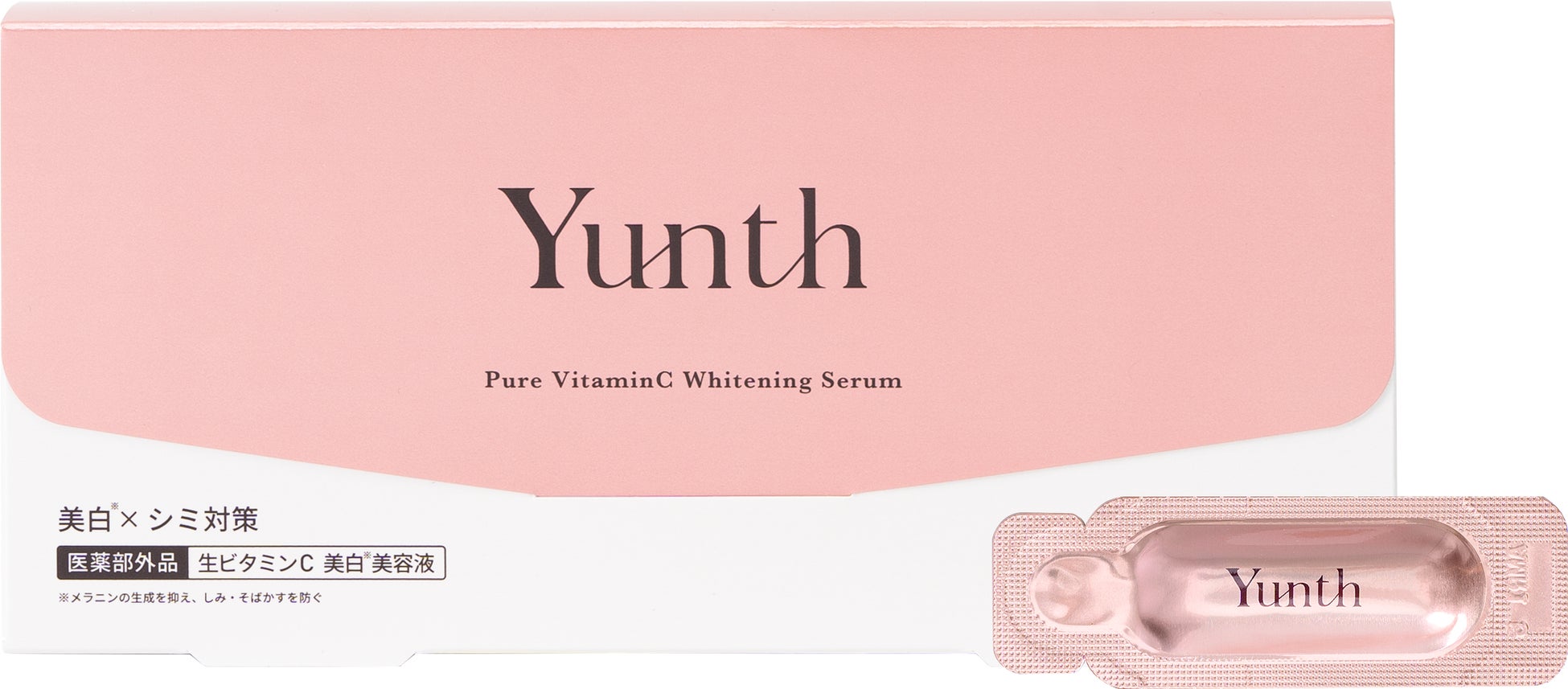 Yunth 生ビタミンC美白美容液は、生ビタミンC※2を独自の処方で閉じ込めた”使用期限30秒※1”の導入美容液です。有効成分アスコルビン酸(純粋ビタミンC)が、メラニンの生成を抑え、しみ・そばかすを防ぎます。使うたびに新鮮な状態で使える個包装パッケージ、高保湿でありながらもベタつかないトロッとした独自のテクスチャーなど、こだわりが詰まったアイテムです。