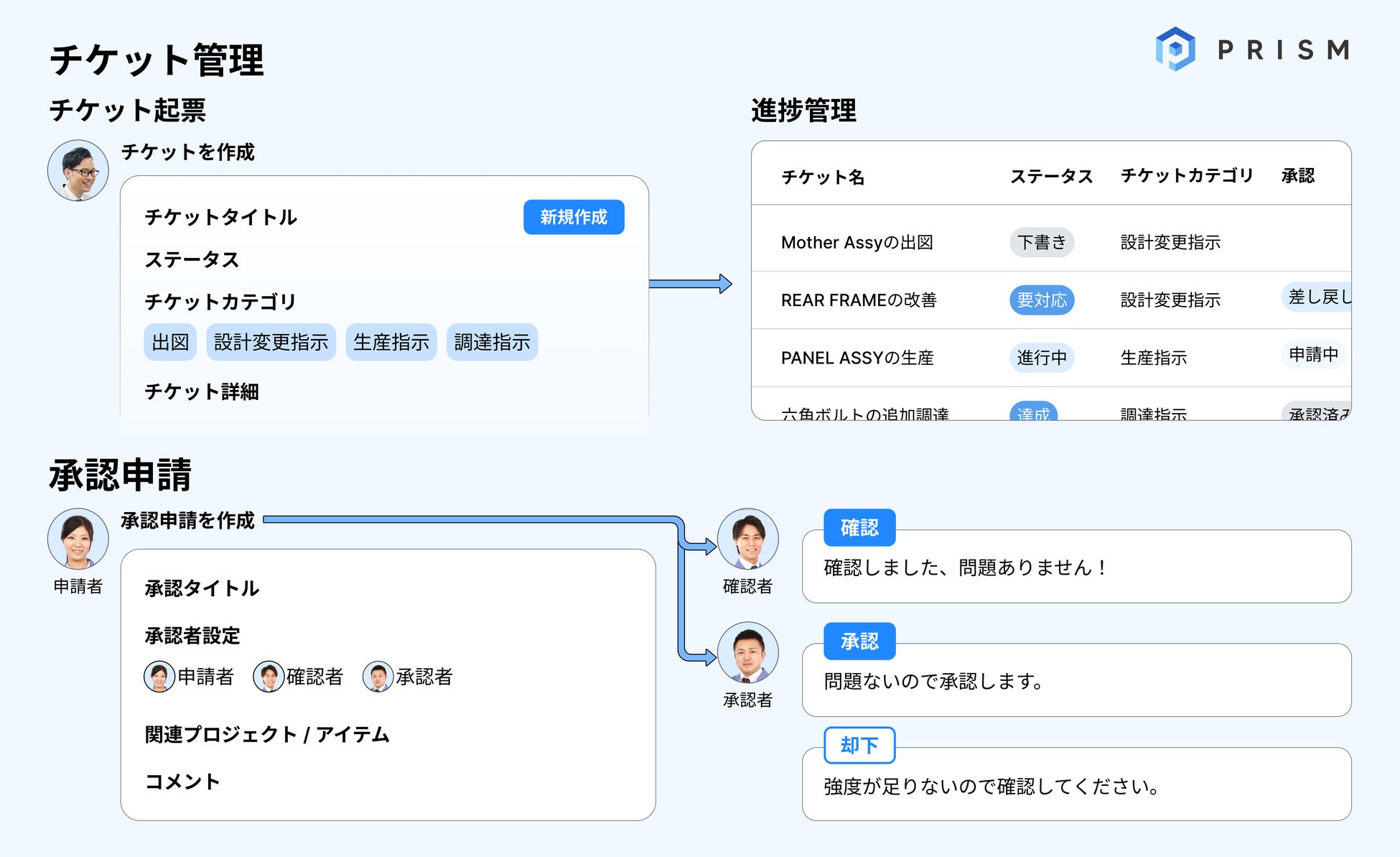今回の「チケット機能」追加により設計変更依頼の作成と承認プロセスの管理が可能となりました。これまでは紙媒体での回付やメールにしか変更経緯は残りませんでしたが、「PRISM」上でBOMや図面と関連付けて確認・管理できるようになりました。承認先の指定ならびに複数のBOMや図面の変更に対する承認が実装されたことで、設計変更ワークフローにかかる工数削減や、より一層正確な変更履歴の記録によるノウハウの蓄積が期待できます。