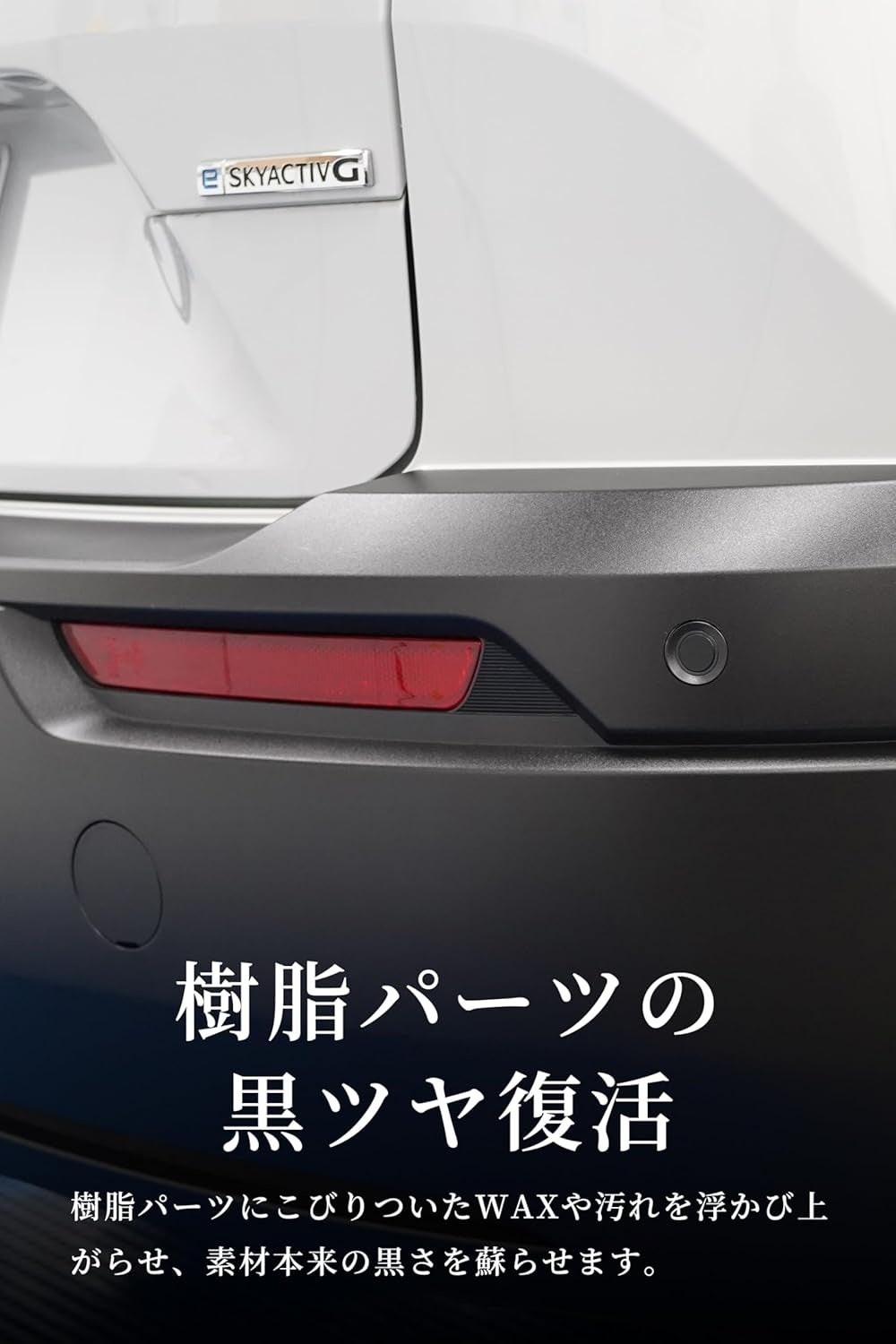 ・本来の黒さが復活: 長期間の風雨や洗車ワックスの付着により白ボケてしまった樹脂パーツにこびりついたWAXや汚れを浮かび上がらせ、素材本来の黒さを蘇らせます。