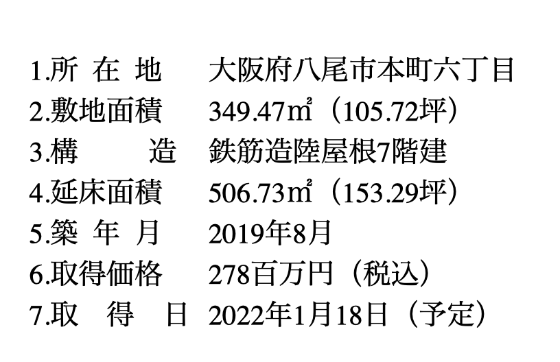 今般、10億円の家賃収入売上達成に向けて、2021年12月24日付で売主と売買契約を締結し、2022年1月18日(予定)付で、大阪府八尾市の賃貸マンション「クレスト八尾」を取得することを決定いたしましたので、お知らせいたします。