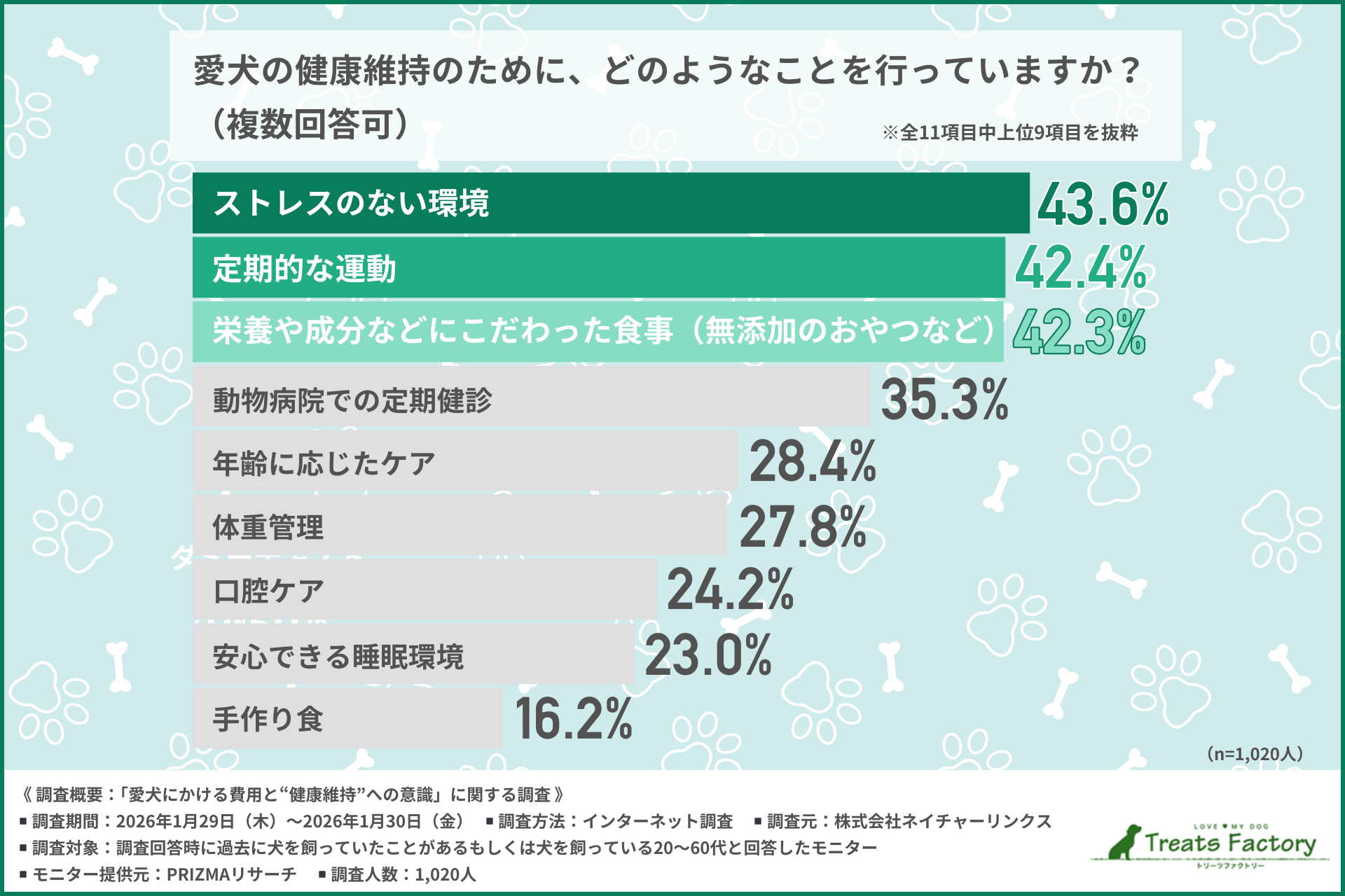 愛犬の健康維持のために実践していること、1位は「ストレスのない環境」