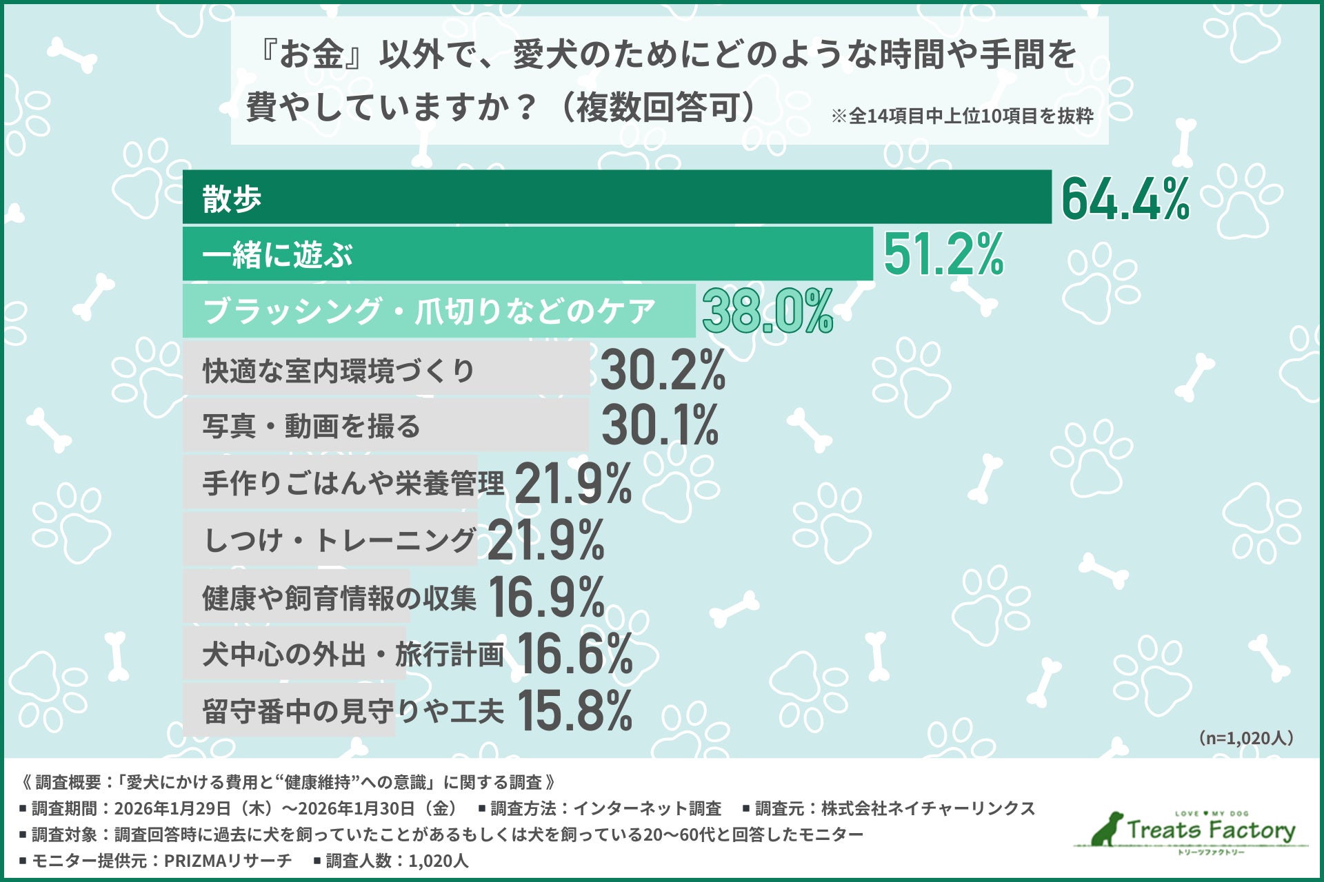 「『お金』以外で、愛犬のためにどのような時間や手間を費やしているか」と尋ねたところ、『散歩(64.4%)』と回答した方が最も多く、『一緒に遊ぶ(51.2%)』『ブラッシング・爪切りなどのケア(38.0%)』となりました。
