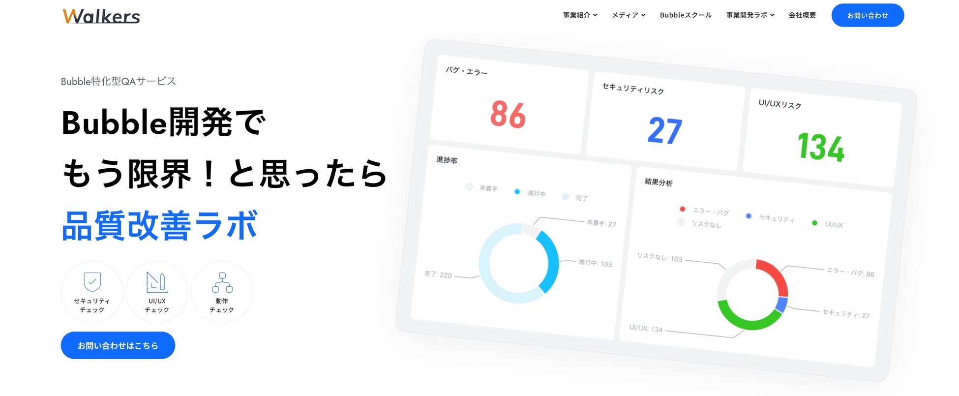 株式会社Walkers(本社:東京都文京区、代表:渡邊 敦司)は、Bubble開発のQAサービス「品質改善ラボ(https://walker-s.co.jp/qa-lab/)」の提供を開始いたします。