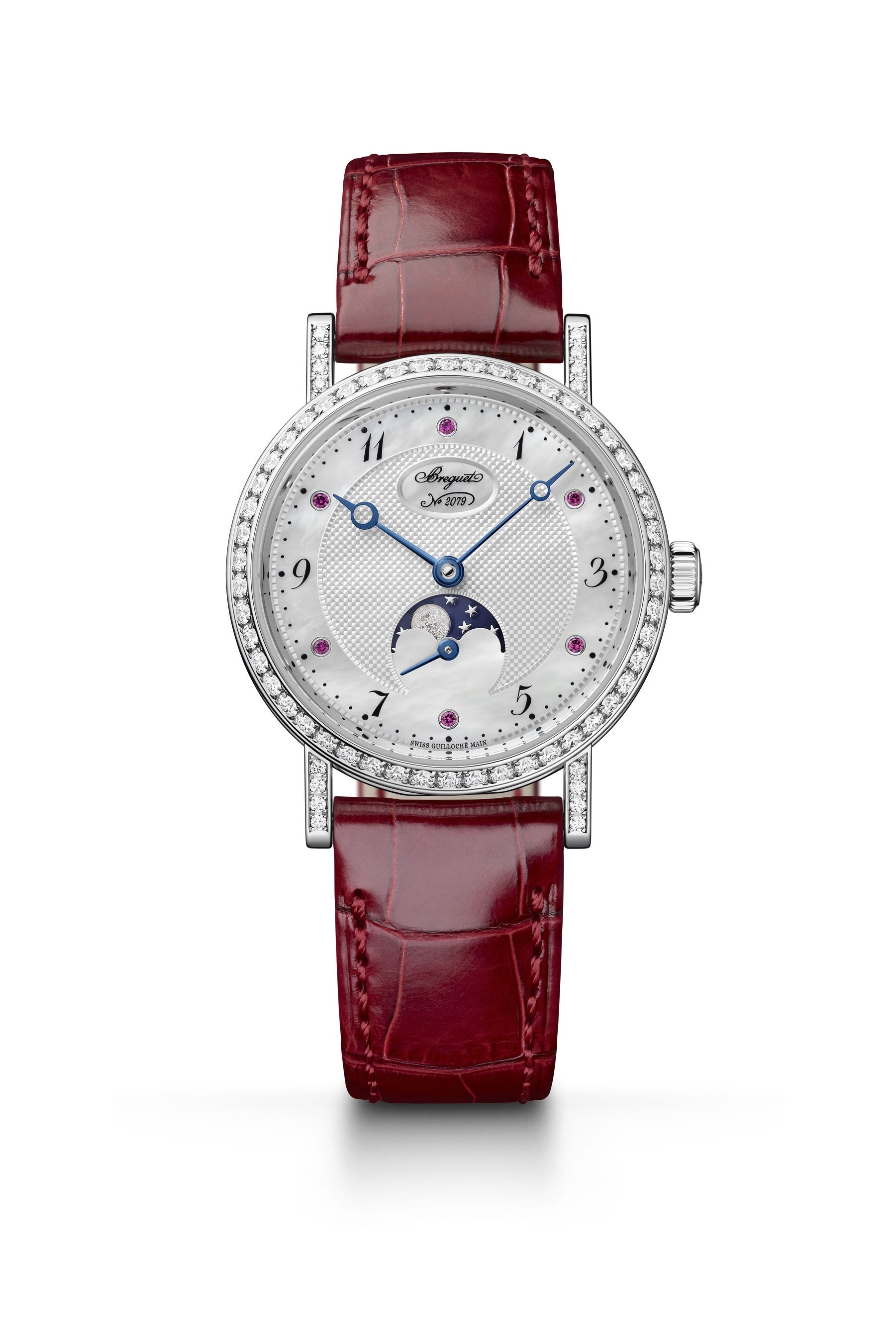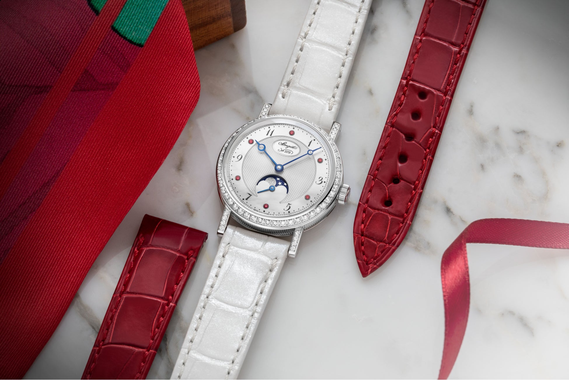 ブレゲは、ルビーを配したホワイトマザーオブパールがダイヤルを優美に飾る新しい「クラシック ムーンフェイズ」によって愛を讃美します。