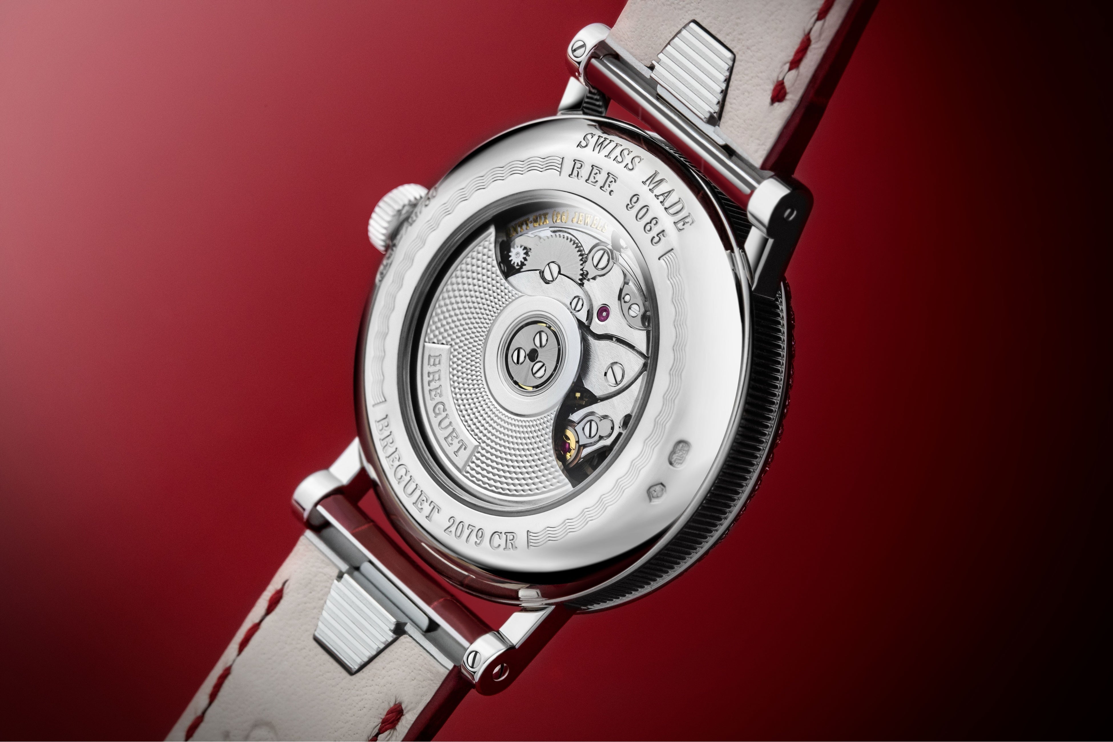 ロジウムメッキ仕上げの自動巻ムーブメントは、テンプ振動数3.5Hzで、45時間のパワーリザーブが備わり、インライン・スイスレバー脱進機のガンギ車とひげゼンマイにシリコン素材が用いられています。このシリコン素材には数多くの優れた性質があります。腐食や損耗への耐性に加え、磁場の影響を受けず、時計の精度向上にも貢献します。ケース裏面からは、サファイア・ケースバックを通して、さまざまな部品に施された面取りやコート・ド・ジュネーブ模様など、ブレゲが最も大切にする技術のひとつに数えられる装飾仕上げが鑑賞できます。そしてケースには3気圧(30m)の防水機能を備えます。