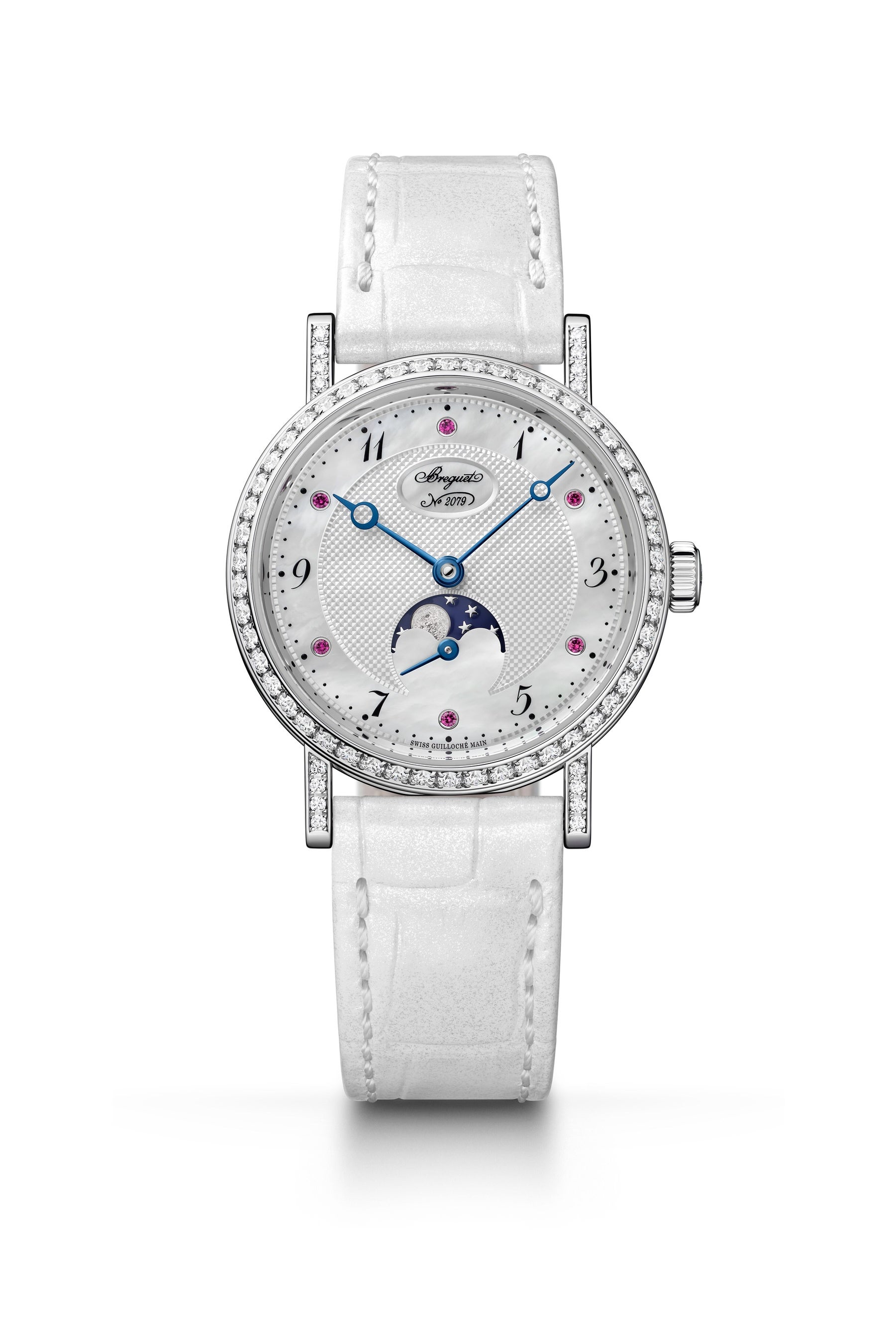マザーオブパールのダイヤルには、ブレゲ・マニュファクチュールの職人の手作業による非常に繊細なギヨシェ彫りの模様が施されています。6時位置に表示されるムーンフェイズは、ゴールドをハンマーで叩いて立体的に仕上げた月を配し、その周りにゴールドの星を散りばめ、ラッカーで仕上げたミッドナイトブルーの夜空が広がります。12時位置には、楕円のモチーフにブレゲのサインがあります。そして、ホワイトゴールドを用いた直径30mmのケースとラグは66個のブリリアントカット・ダイヤモンドで装飾されています。このモデルは、世界のブレゲ ブティック限定28本で展開されます。