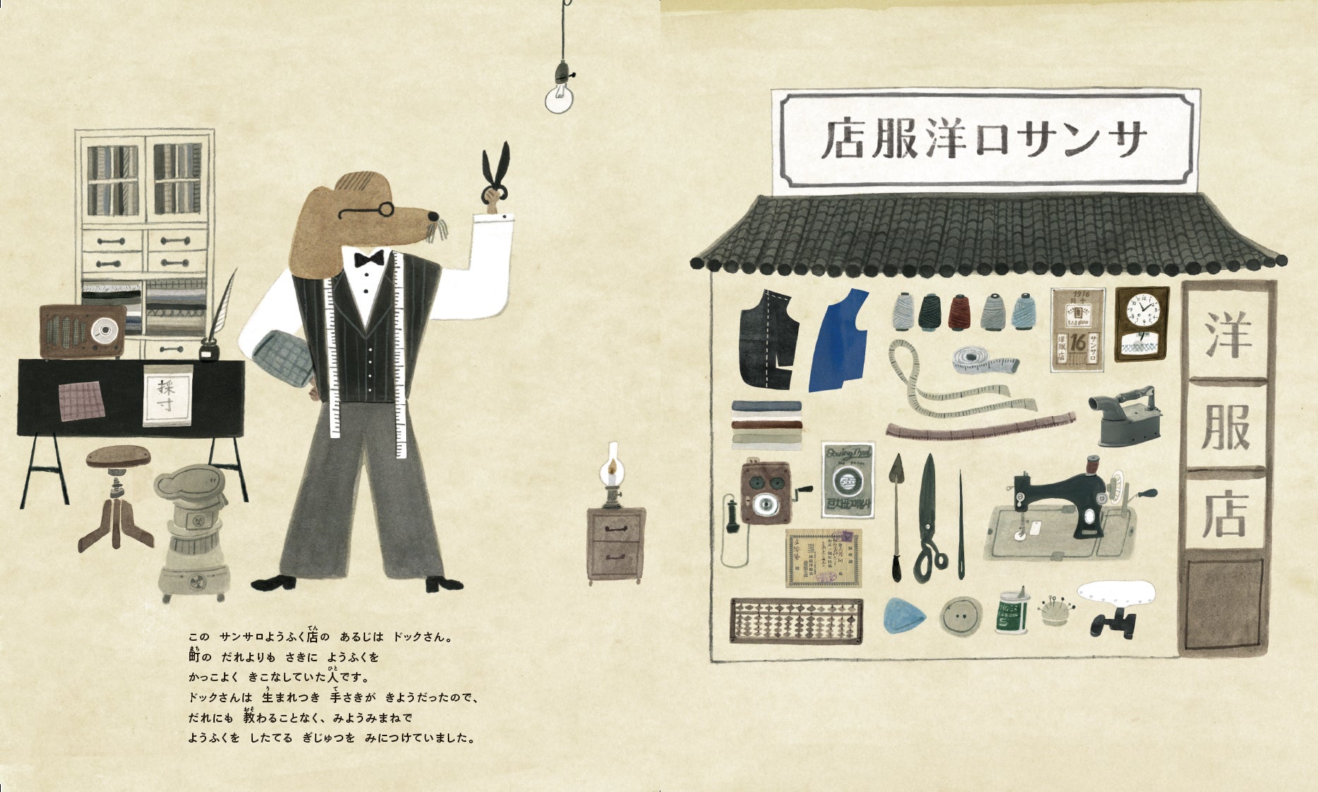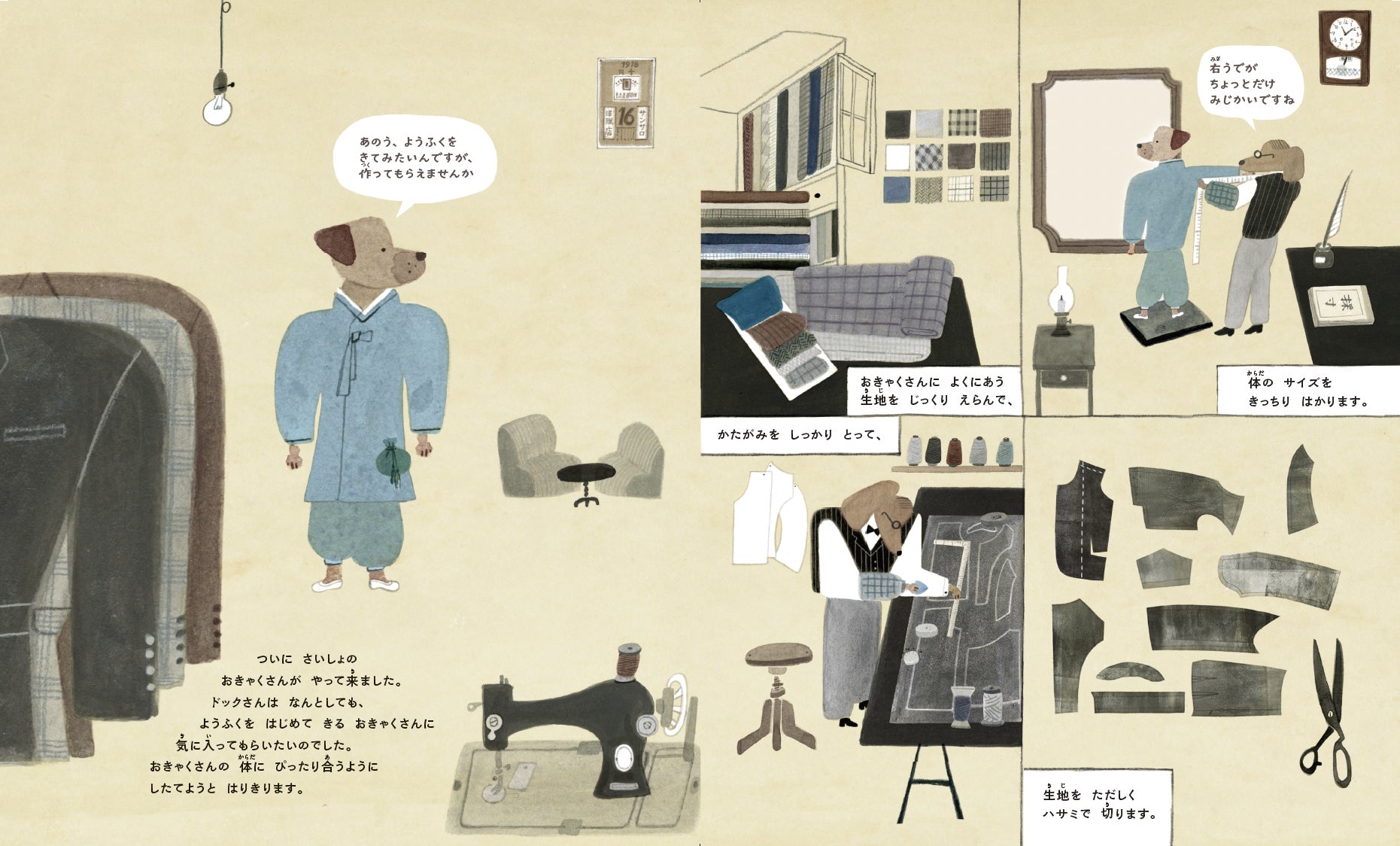 ボローニャ展でも評価された落ち着いたやさしい色合いの絵と、親子孫三世代の主人がお客さんのために洋服を紡ぐ姿に思わずじんわり暖かい気持ちになるおはなし。
