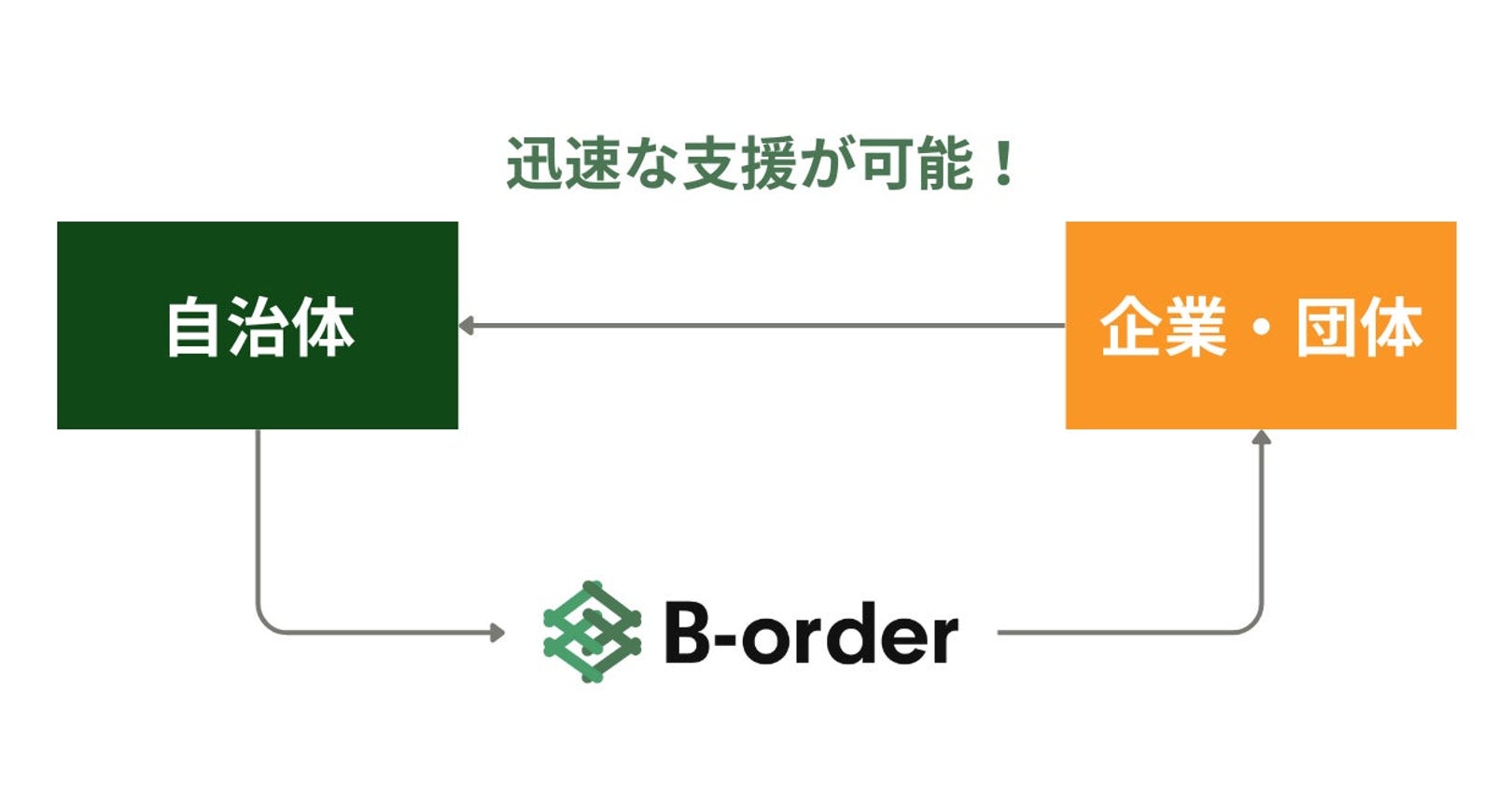 B-orderは各自治体に導入頂き、協定を結ぶ組織にもアカウントを発行することで、支援の要請が可能となります。各自治体は、それぞれが行うプル型支援において、B-orderを活用して頂くことができます。