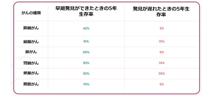 医療の発展により、がんは治る病となってきました。しかし、早期発見と発見が遅れたときでは、生存率が大幅に違います。早期に発見できたら、多くの確立で治癒を目指すことができるのです。