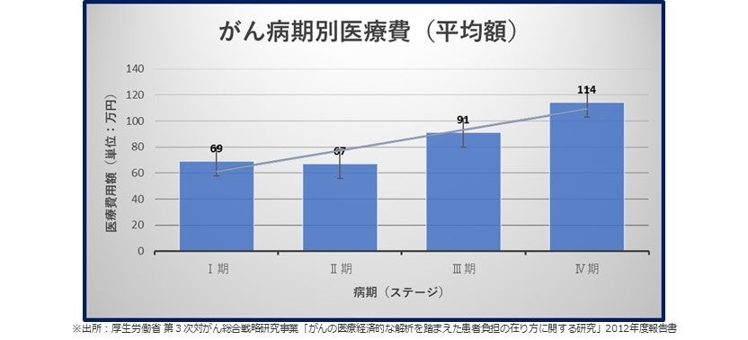 厚生労働省の研究事業で行った調査によると、入院費なども含めた病期別の平均自己負担(間接費用を含む)年額は、Ⅰ期69万円、Ⅱ期67万円、Ⅲ期91万円、Ⅳ期114万円で、ステージ(病期)が進むにつれ、費用も高額になっていきます。