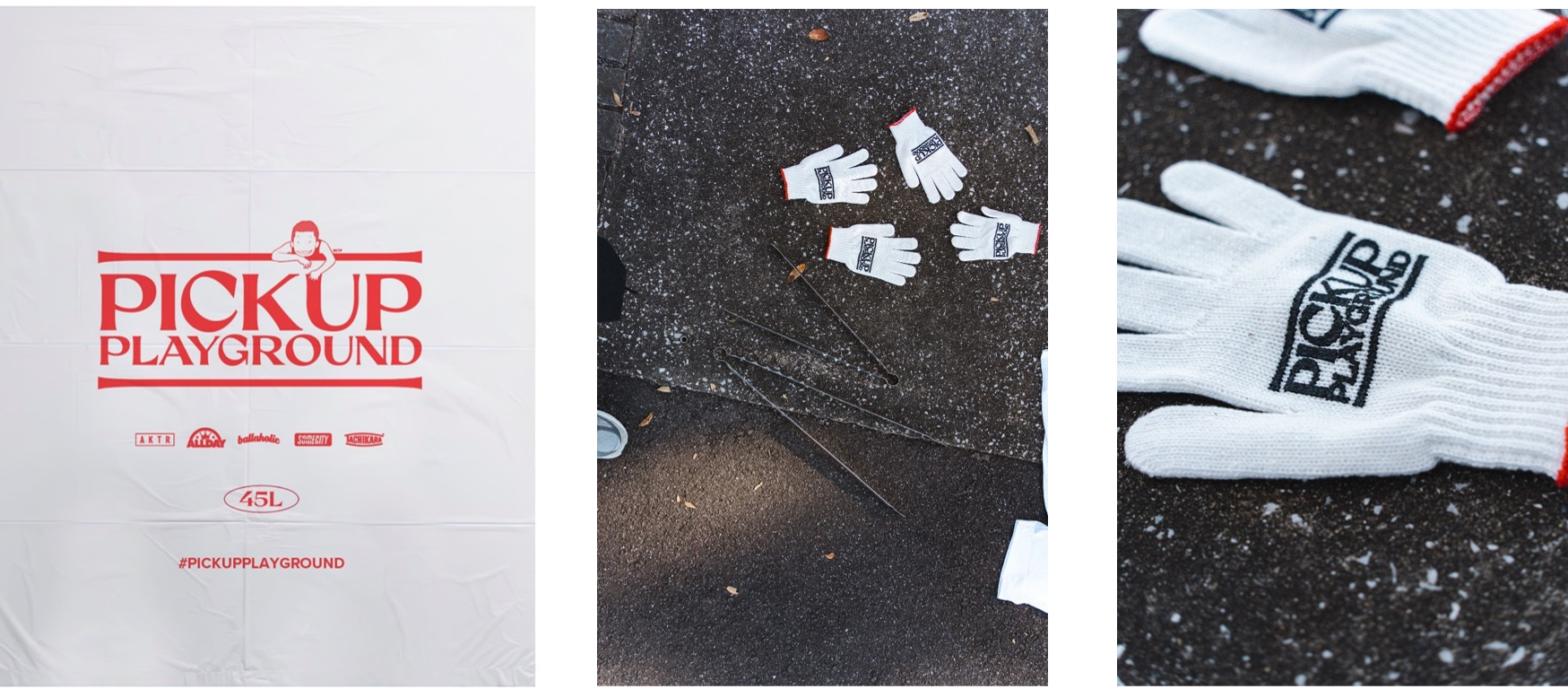 「PICK UP PLAYGROUND」では、プロジェクトロゴがプリントされた軍手・トング・ゴミ袋を製作し、イベントのゴミ拾いに 使用します。このゴミ拾いキットは全国のプレイグラウンドでプロジェクトに参加したいプレイヤーや自治体を募集し、 無償で寄贈、各地でのピックアップゲーム&ゴミ拾いイベントをサポートします。