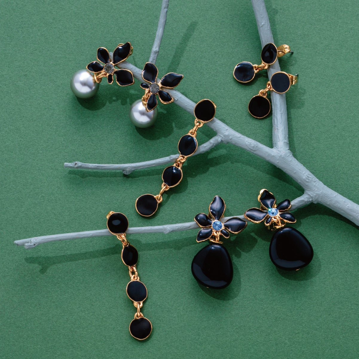 パリ市内に構えた工房で、職人たちが手作業で作るこのエマイユシリーズは、これまでもホワイトやイエロー、バイオレットやローズなどカラフルな色で、さまざまなアイテム、形が発表されてきましたが、この秋冬は黒に注目です。一枚一枚、手で模った花モチーフのリングやイヤリングや、揺れるピアス、エレガントなバングルなど、凛としていながらもさりげない女性らしさを醸し出すアイテムが勢揃いしました。