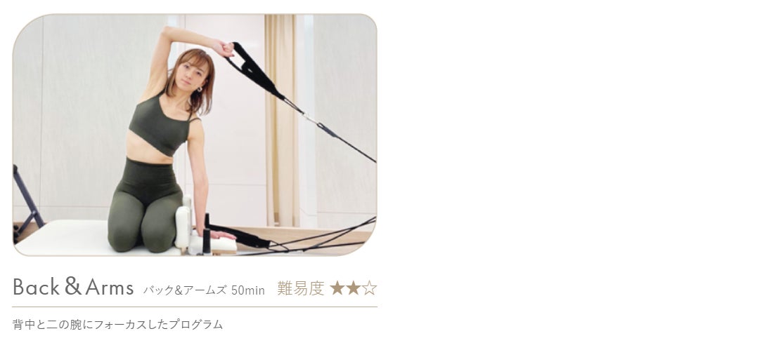Back&Arms(難易度★★☆)肩や背骨を様々な方向から丁寧に動かして柔らかくしなやかに整えて、気になる二の腕はしっかりと引き締め、猫背や反り腰などの姿勢のお悩みや、肩こりや腰痛などの日常生活での痛みの改善を目指していく中級クラス