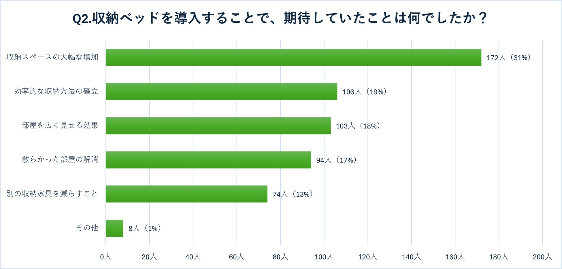 「Q2. 収納ベッドを導入することで、最も期待していたことは何でしたか?(複数選択可)」との質問に対して、結果は次のようになりました。
