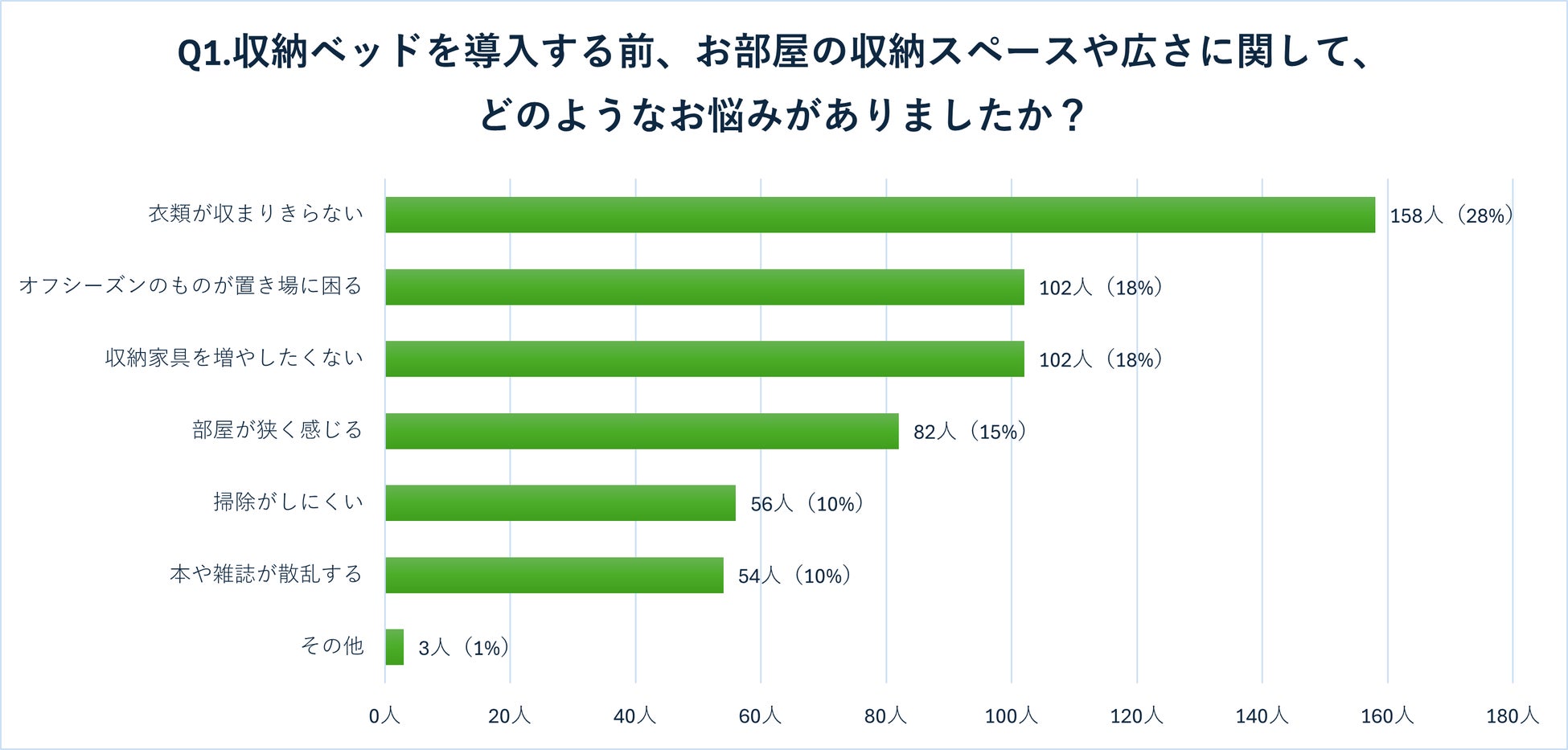 「Q1. 収納ベッドを導入する前、お部屋の収納スペースや広さに関して、どのようなお悩みがありましたか?(複数選択可)」との質問に対し、結果は次のとおりとなりました。