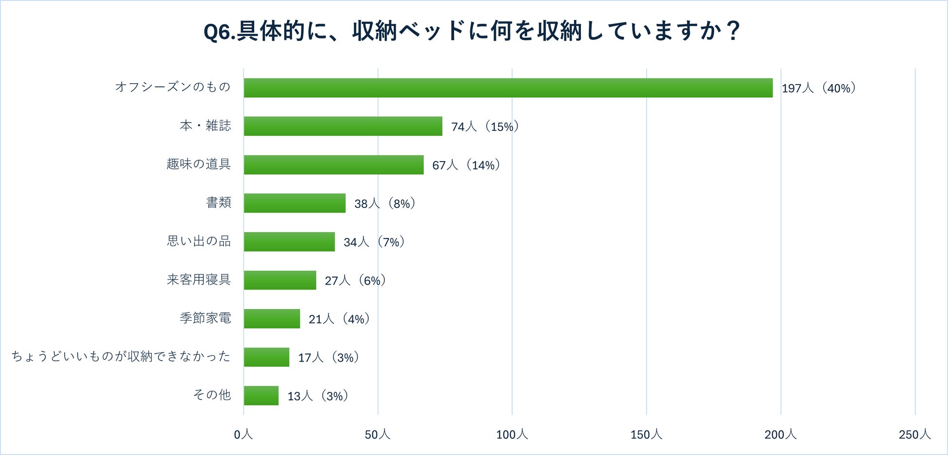 「Q6. 具体的に、収納ベッドに何を収納していますか?(複数選択可)」との質問に対し、結果は次のようになりました。