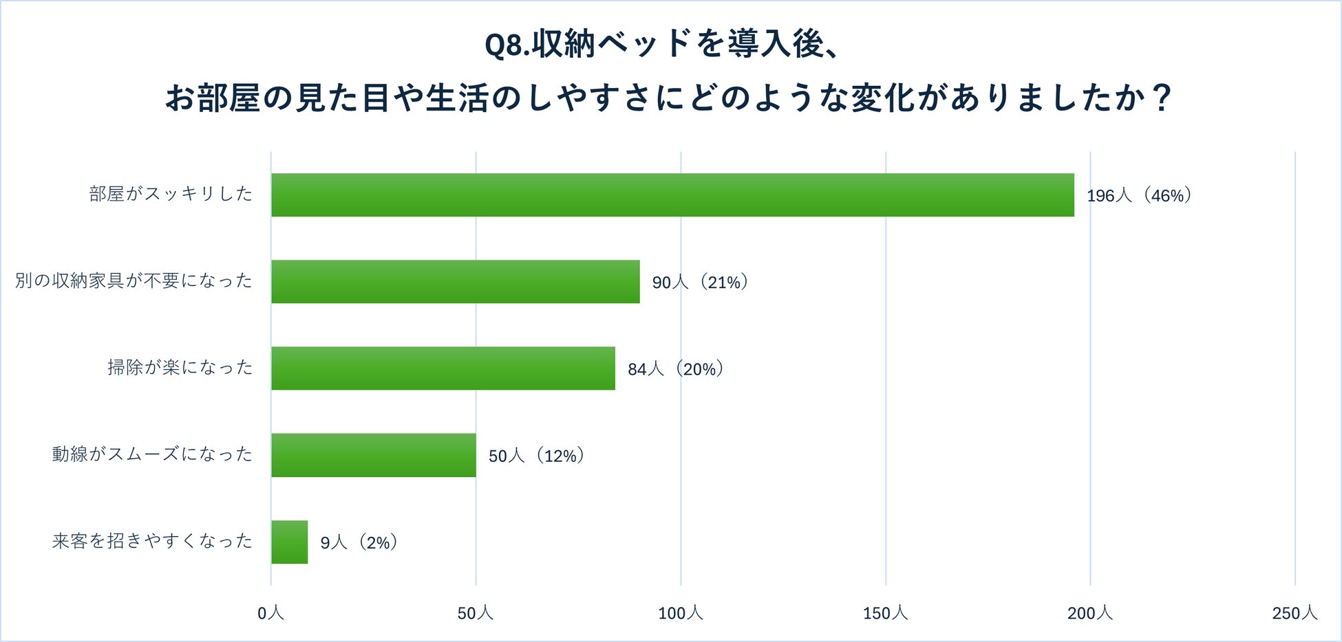 「Q8. 収納ベッドを導入後、お部屋の見た目や生活のしやすさにどのような変化がありましたか?(複数選択可)」との質問に対し、結果は次のようになりました。